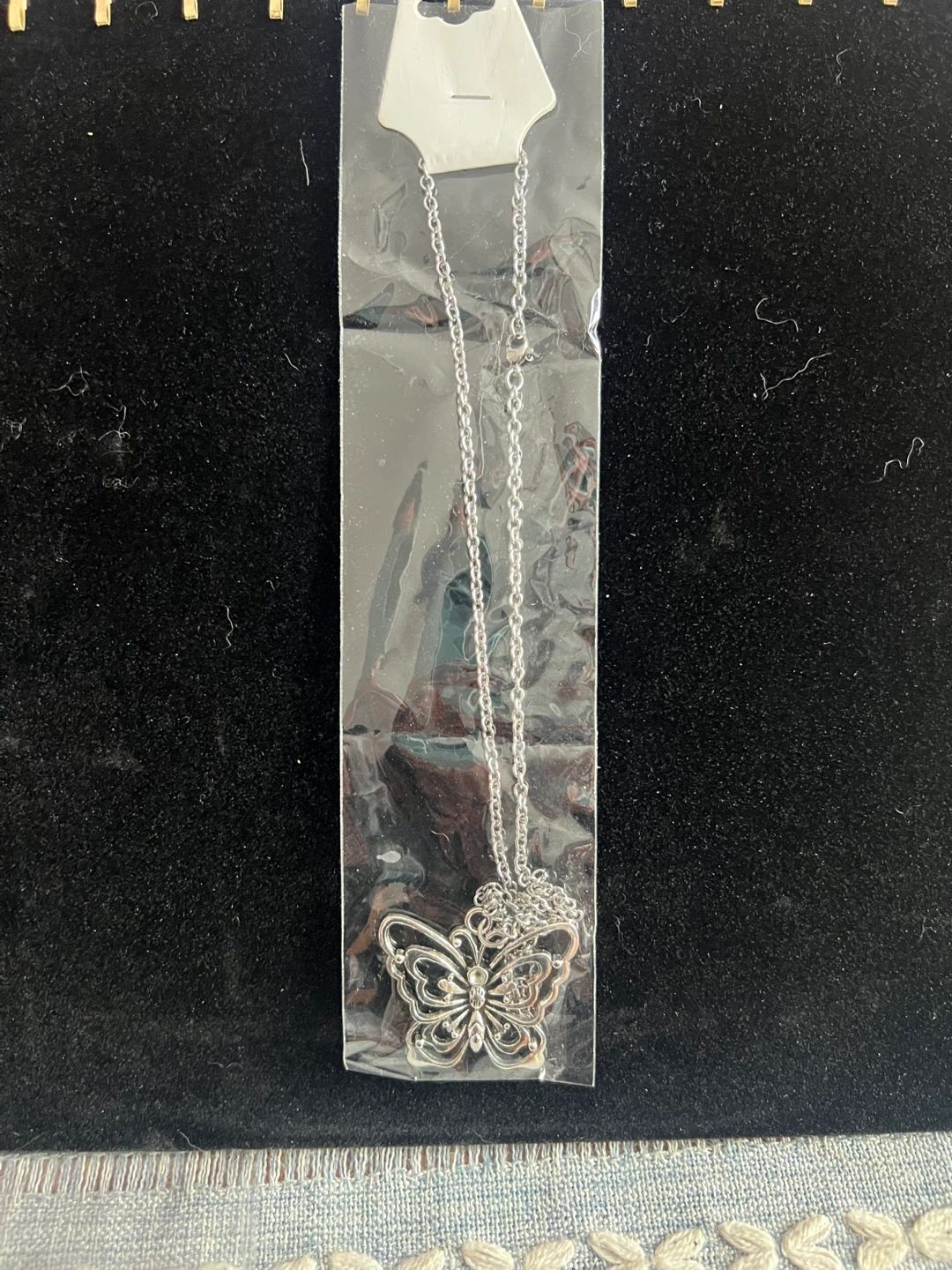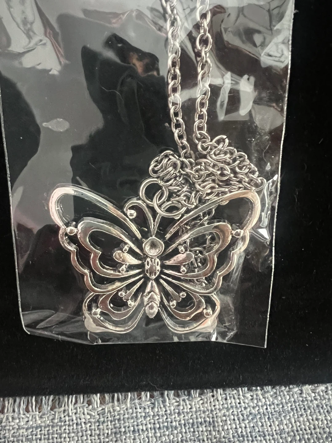 Selling a silver-colored butterfly necklace. It's still in its original packaging and has never been worn. It would be a great gift for someone who loves butterflies or wants to add a touch of whimsy to their outfit