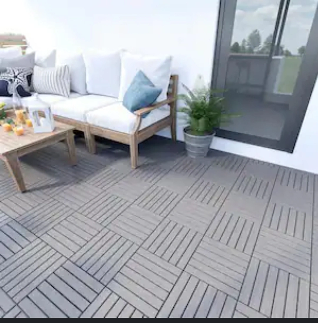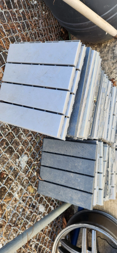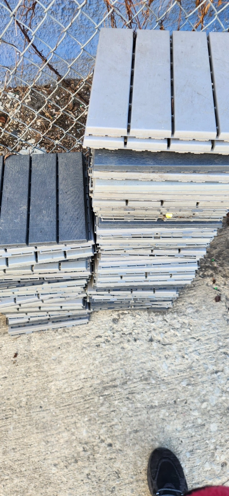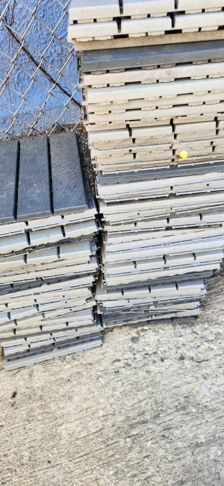 ikea Stack of interlocking plastic deck tiles. Two colors: gray and dark gray . Great for patios, balconies, or other outdoor spaces. Easy to install and maintain. Sold as a bundle.