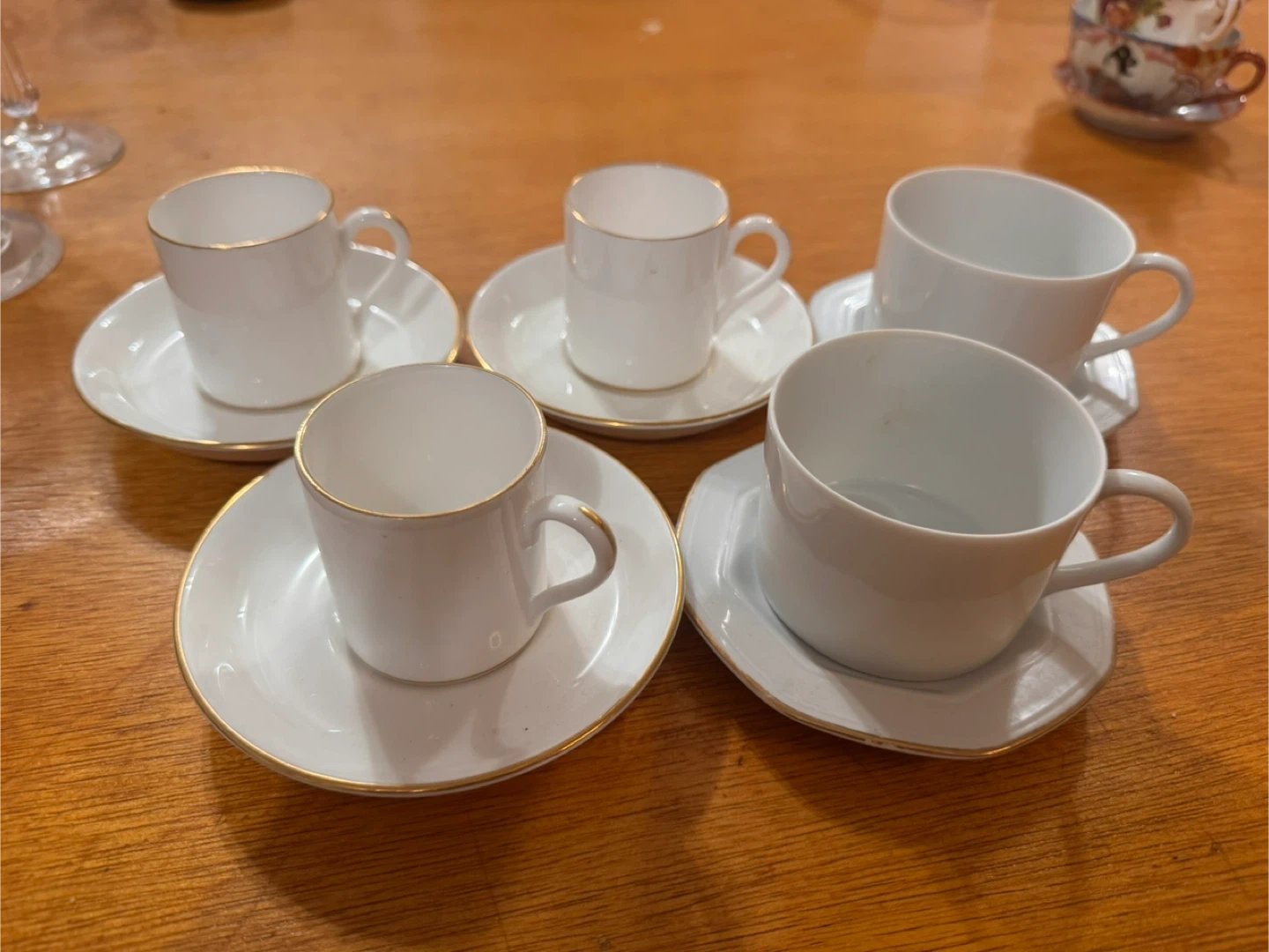 Here's a set of five espresso cups and saucers. They are white with a gold trim. Perfect for your morning coffee!