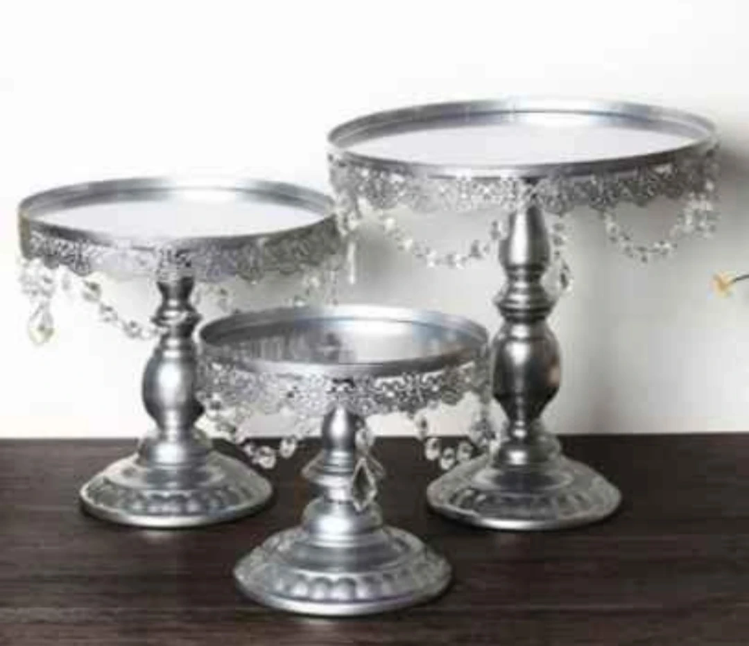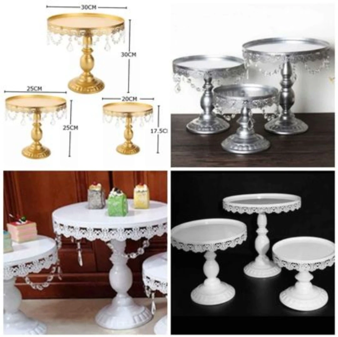 This set includes three cake stands of varying sizes with sparkling crystal dangles. Perfect for displaying cakes or desserts at parties and celebrations!