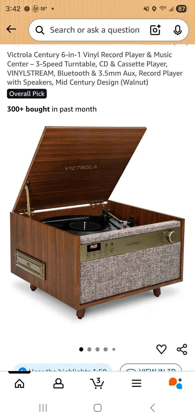The Victrola Century pairs mid-century modern design with a 3-speed turntable, Bluetooth, VINYLSTREAM output, CD player, cassette player, and 3.5 mm aux input for versatile playback options. Enjoy rich, room-filling sound with built-in, custom-tuned speakers engineered for premium audio performance without the need for external components. Stream music directly from your smartphone or tablet via Bluetooth, eliminating clutter and cables for a seamless setup. Stream your favorite records directly to Bluetooth-enabled speakers or headphones with integrated VINYLSTREAM Bluetooth output. Use the built-in headphone jack for solo sessions, or connect to external systems through the RCA output for enhanced flexibility. Included Components: 1β feet, Instruction Manual, Power adapter, Record Player. Special Feature: AUX Input, Built In Speaker, Dust Cover, Headphone Jack Output, RCA Output. Material: Engineered Wood. Item Weight: 8.17 Kilograms. Maximum Rotational Speed: 78 RPM. Brand: Victrola.