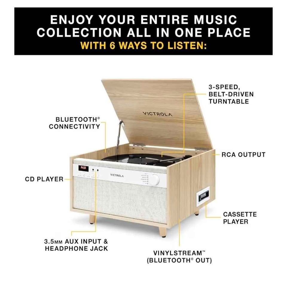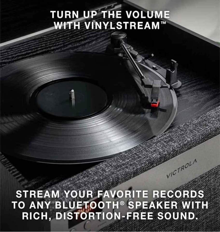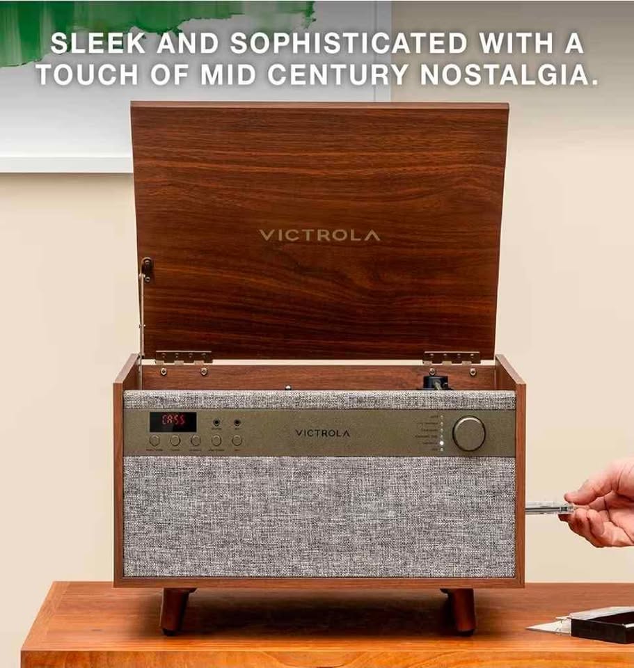 The Victrola Century pairs mid-century modern design with a 3-speed turntable, Bluetooth, VINYLSTREAM output, CD player, cassette player, and 3.5 mm aux input for versatile playback options. Enjoy rich, room-filling sound with built-in, custom-tuned speakers engineered for premium audio performance without the need for external components. Stream music directly from your smartphone or tablet via Bluetooth, eliminating clutter and cables for a seamless setup. Stream your favorite records directly to Bluetooth-enabled speakers or headphones with integrated VINYLSTREAM Bluetooth output. Use the built-in headphone jack for solo sessions, or connect to external systems through the RCA output for enhanced flexibility. Included Components: 1β feet, Instruction Manual, Power adapter, Record Player. Special Feature: AUX Input, Built In Speaker, Dust Cover, Headphone Jack Output, RCA Output. Material: Engineered Wood. Item Weight: 8.17 Kilograms. Maximum Rotational Speed: 78 RPM. Brand: Victrola.