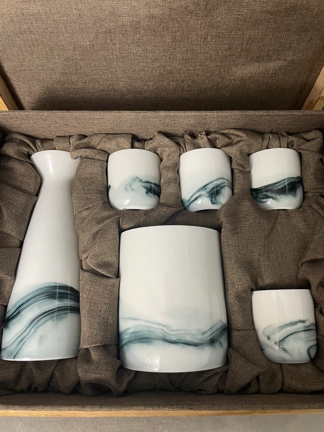 This sake set includes a decanter and five cups, all featuring a beautiful white and green marble design. The set comes in a wooden box with protective foam. It's perfect for enjoying sake with friends.