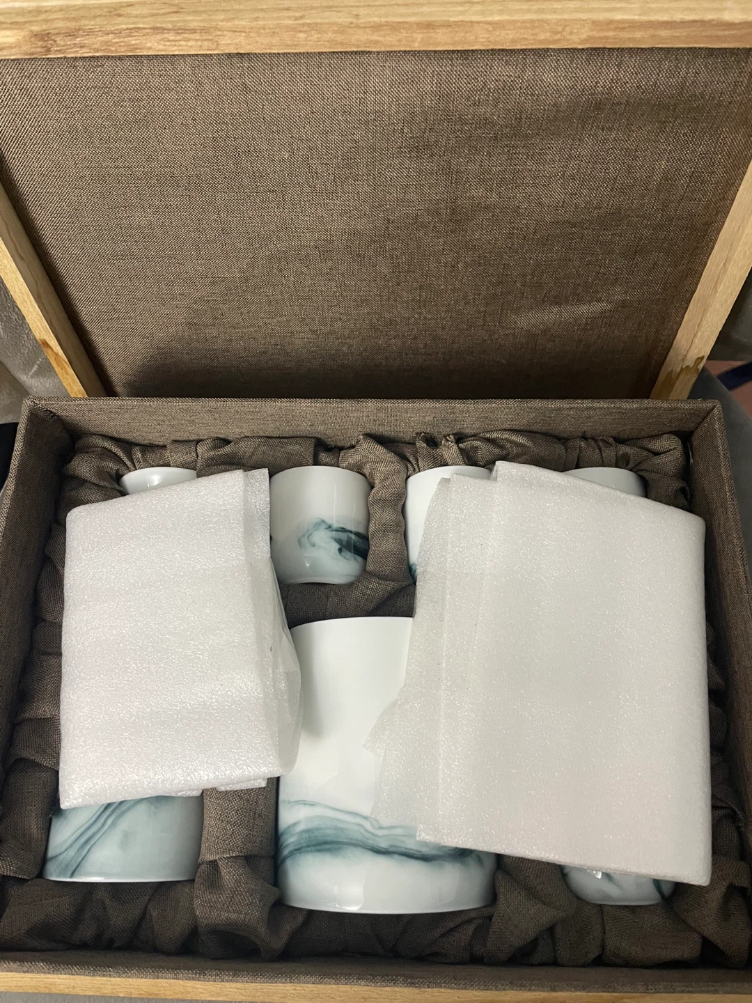 This sake set includes a decanter and five cups, all featuring a beautiful white and green marble design. The set comes in a wooden box with protective foam. It's perfect for enjoying sake with friends.