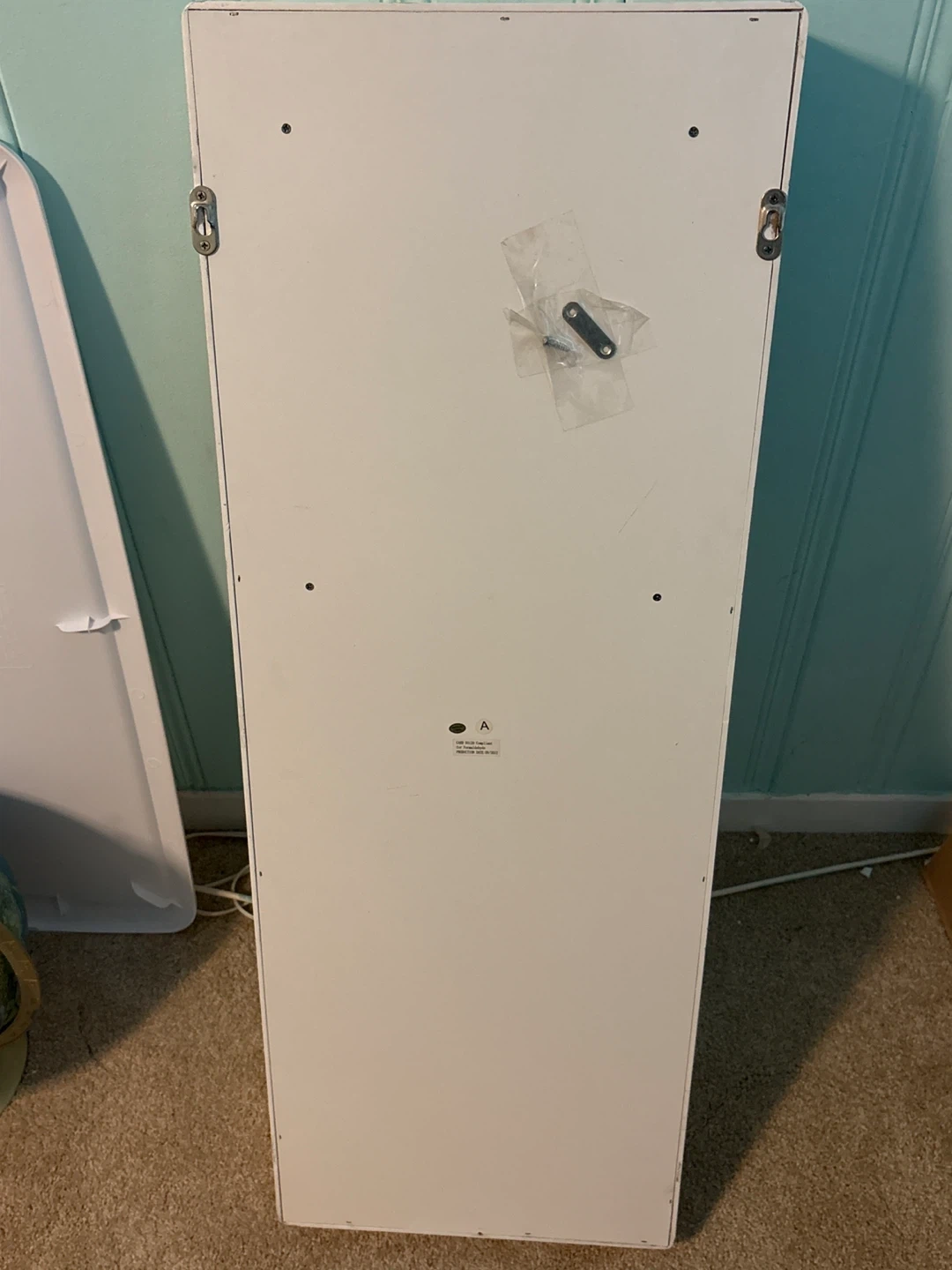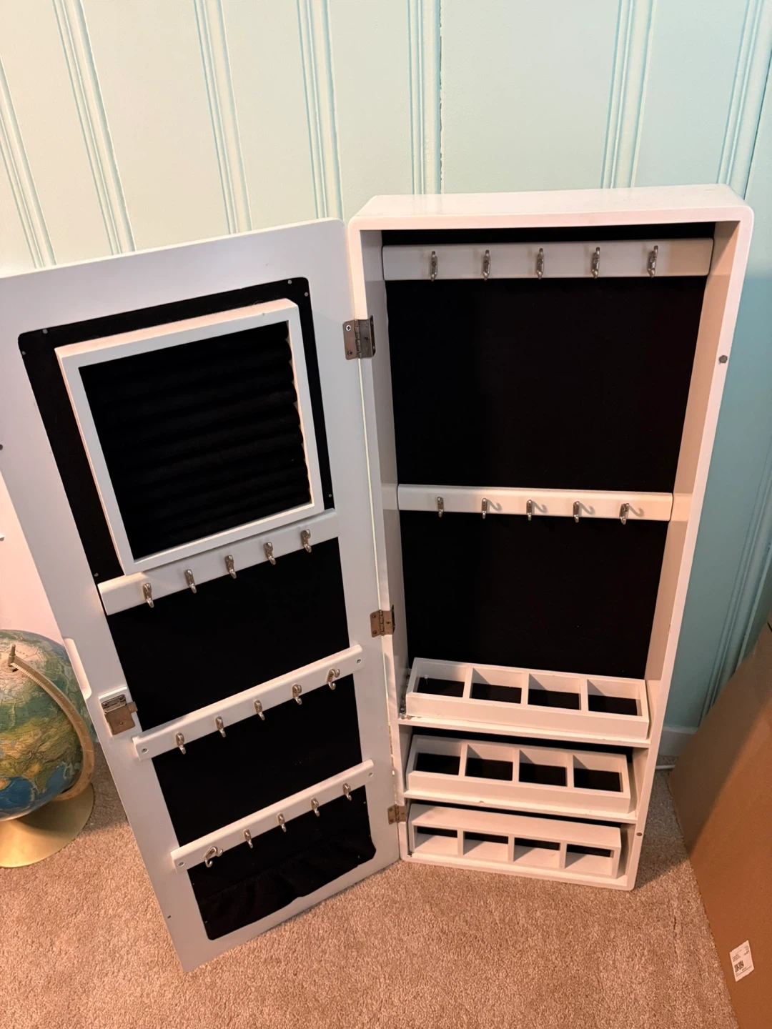 White jewelry armoire with a full-length mirror on the door. It features multiple hooks and compartments for organizing your jewelry and accessories. This armoire is designed for wall mounting or can be hung on a door. Slight damage on bottom right corner but doesn’t affect function and isn’t very noticeable