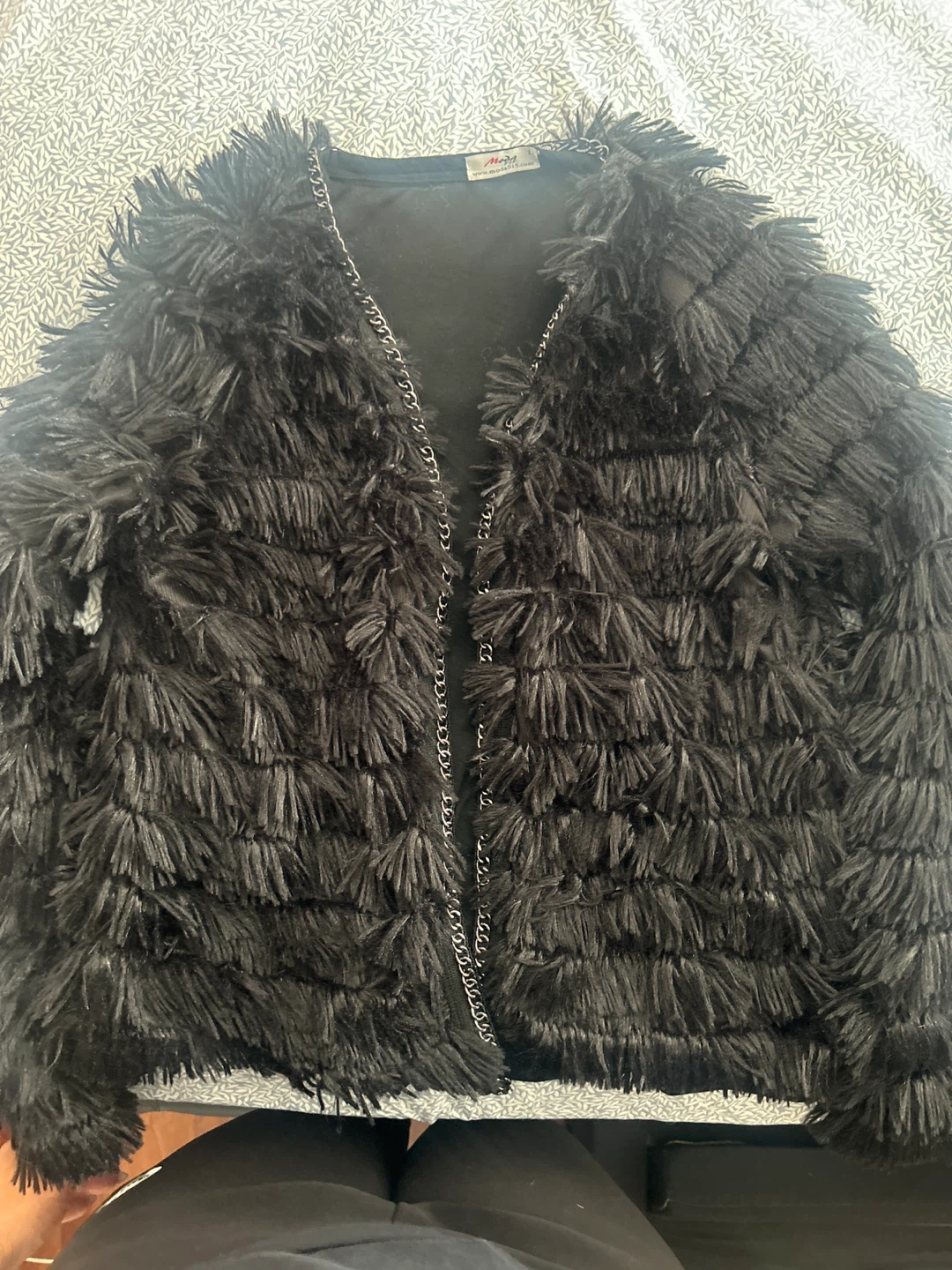 Selling a Moxi brand black faux fur jacket. It has a chain detail and is perfect for adding some edge to your outfit! Size large