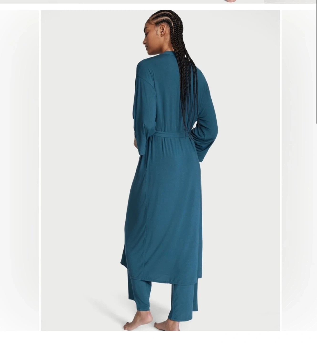 Embroidered Robe: Longline duster style with the VS logo and a matching self-tie belt.