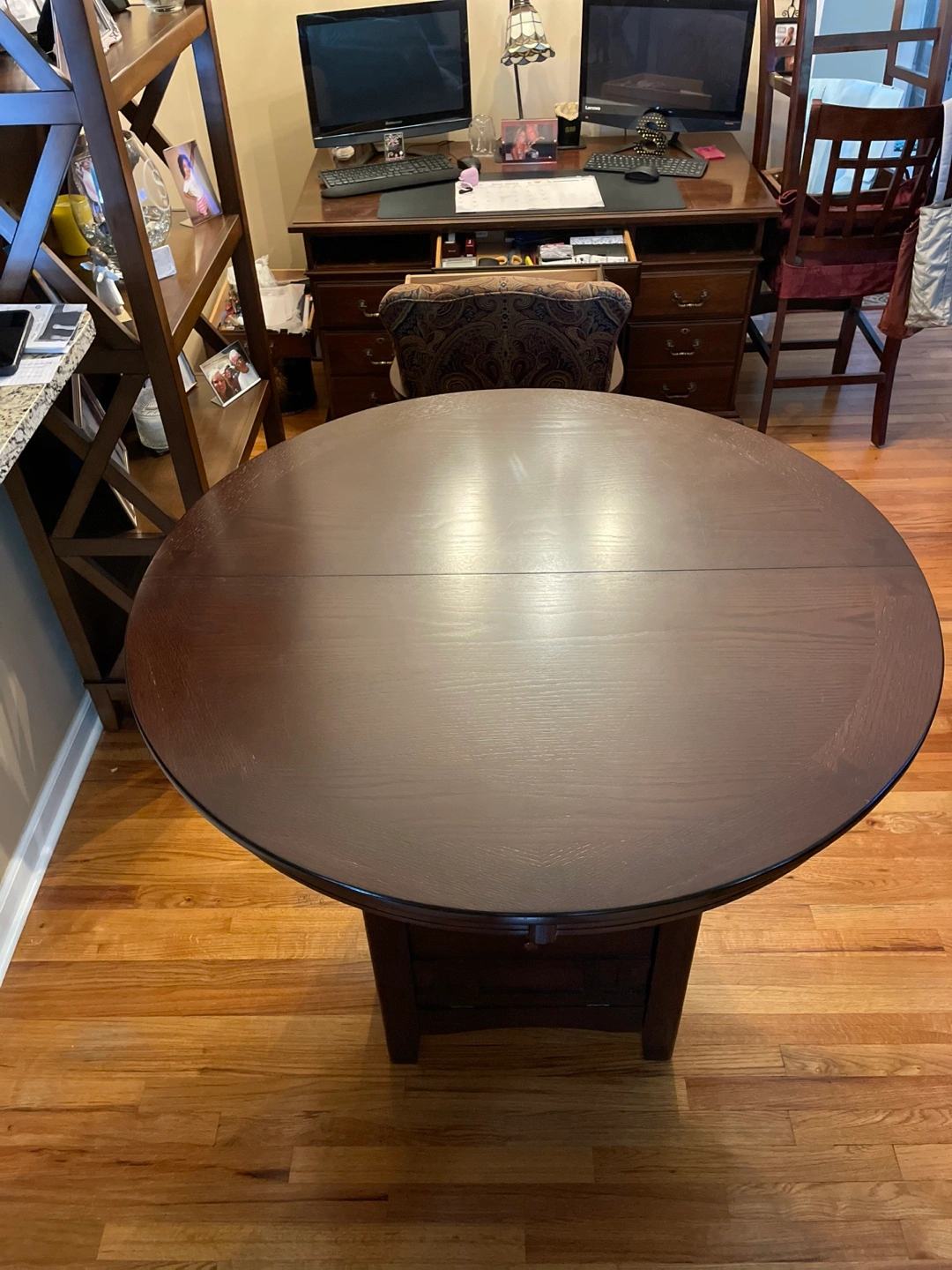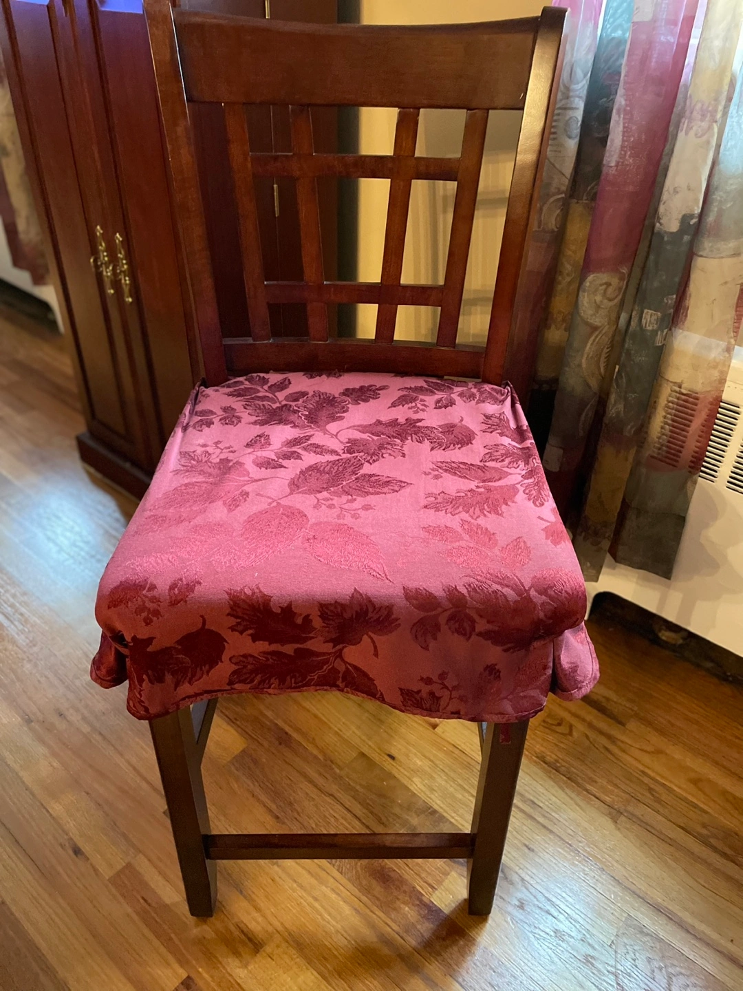Table measures 42” in diameter & height is 36” & comes with a leaf (insert) that measures 18”, which converts the table from round to oblong. Table has a storage area that measures 20”x20”. Chairs - seat height is 25”. The cushions are 17”x17”, cream color. Backrest height from floor is 41”. I have burgundy seat covers that tie on the front & velcro on the back for $25 (set of 4). Price posted does not include the burg and seat covers.