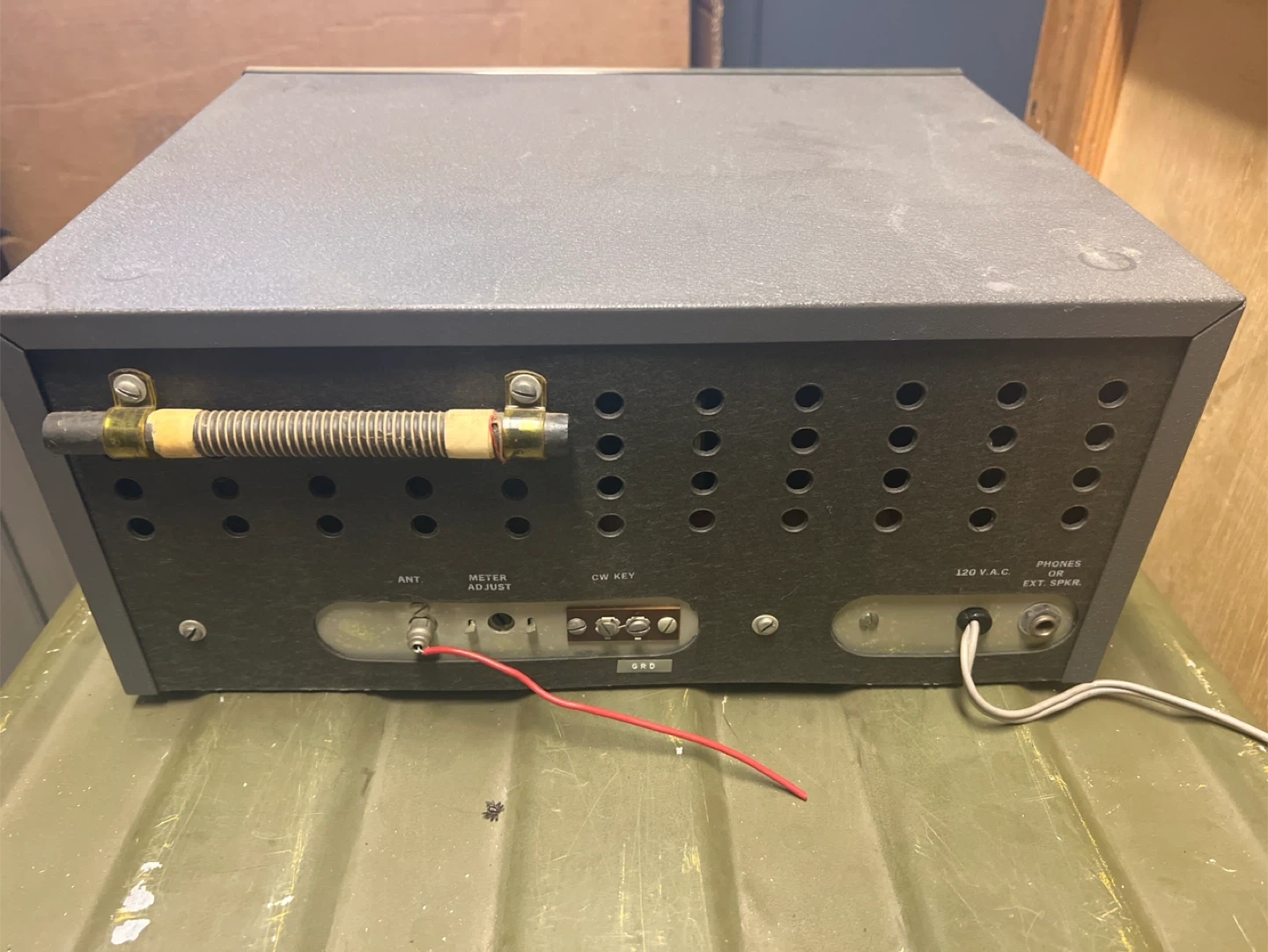 This is a Drake SW-4A shortwave receiver. It covers multiple bands including Standard Broadcast, Maritime, Amateur, and International Broadcast. It has controls for Bandspread, AF Gain, RF Gain, Antenna Trim, Mode, Band, and Main Tuning. The rear panel has connections for Antenna, Meter Adjust, CW Key, 120V AC, and Phones/Ext. Speaker.