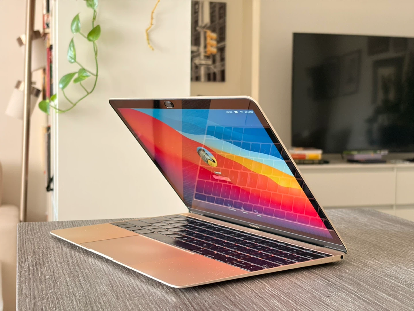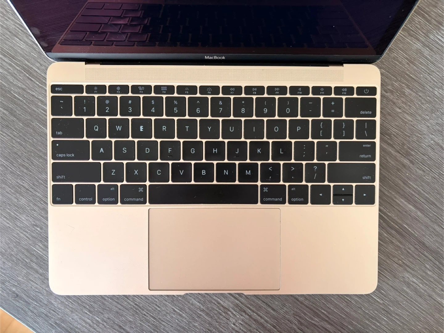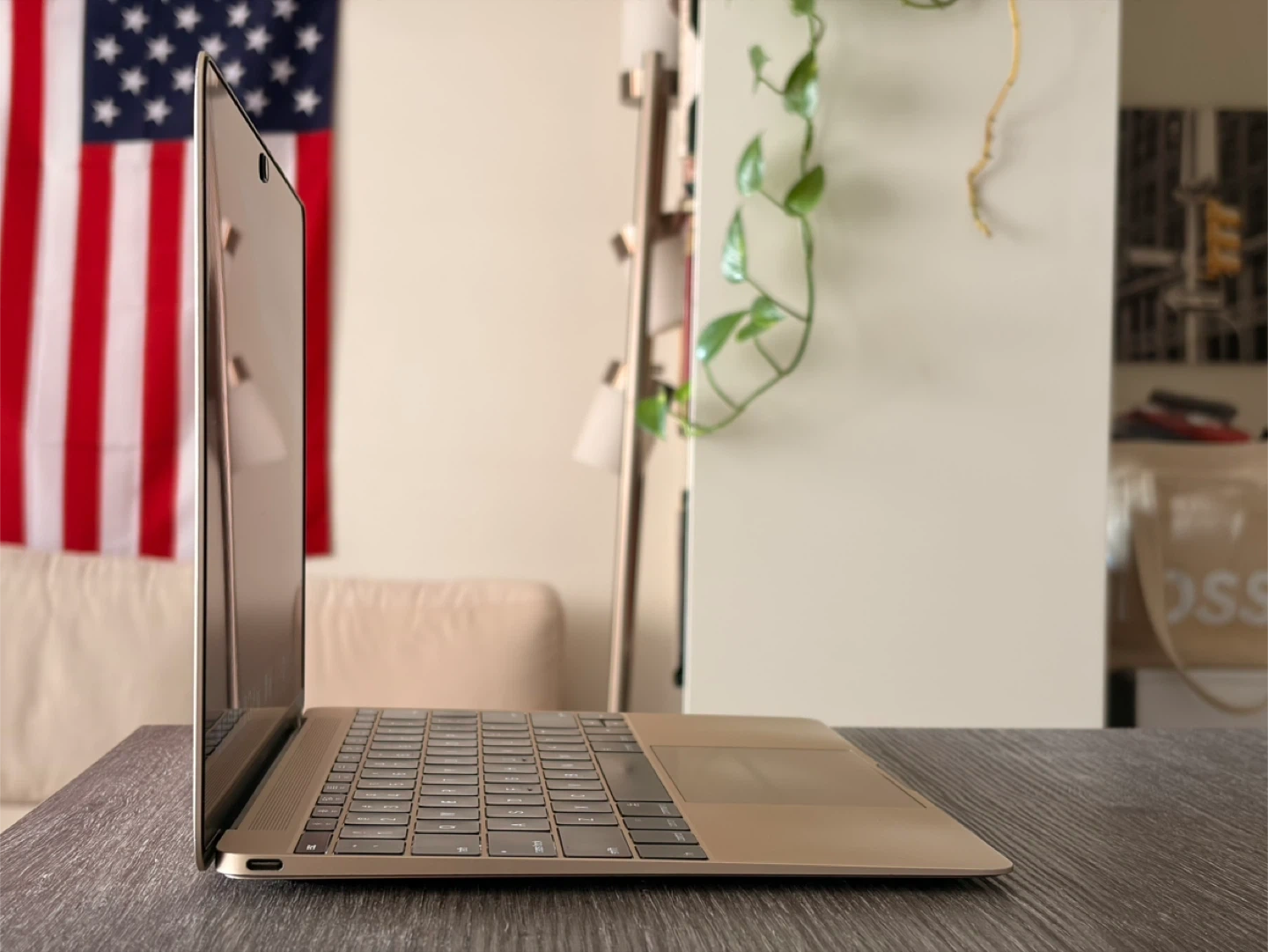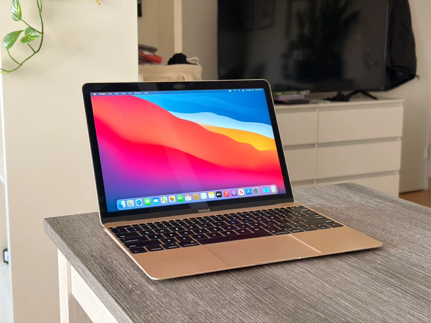 Gold Apple MacBook. It's a compact laptop with a Retina display. Includes a USB-C port.