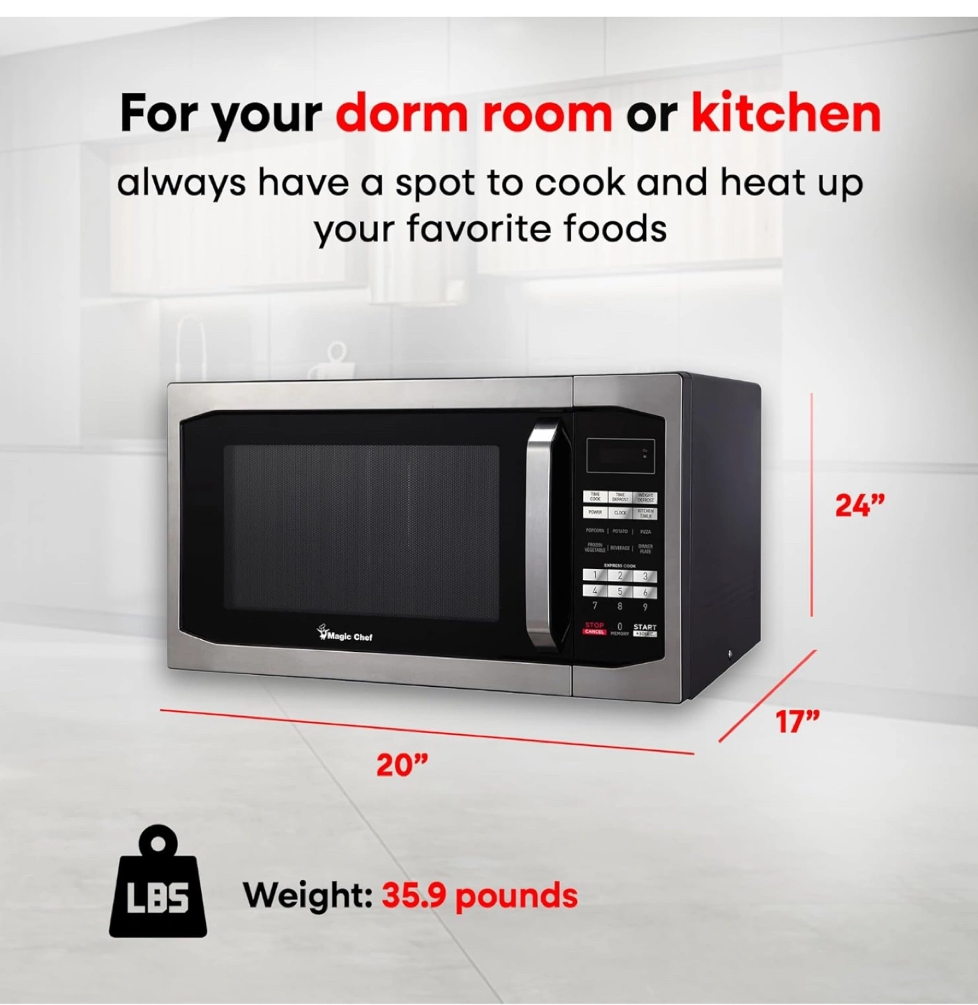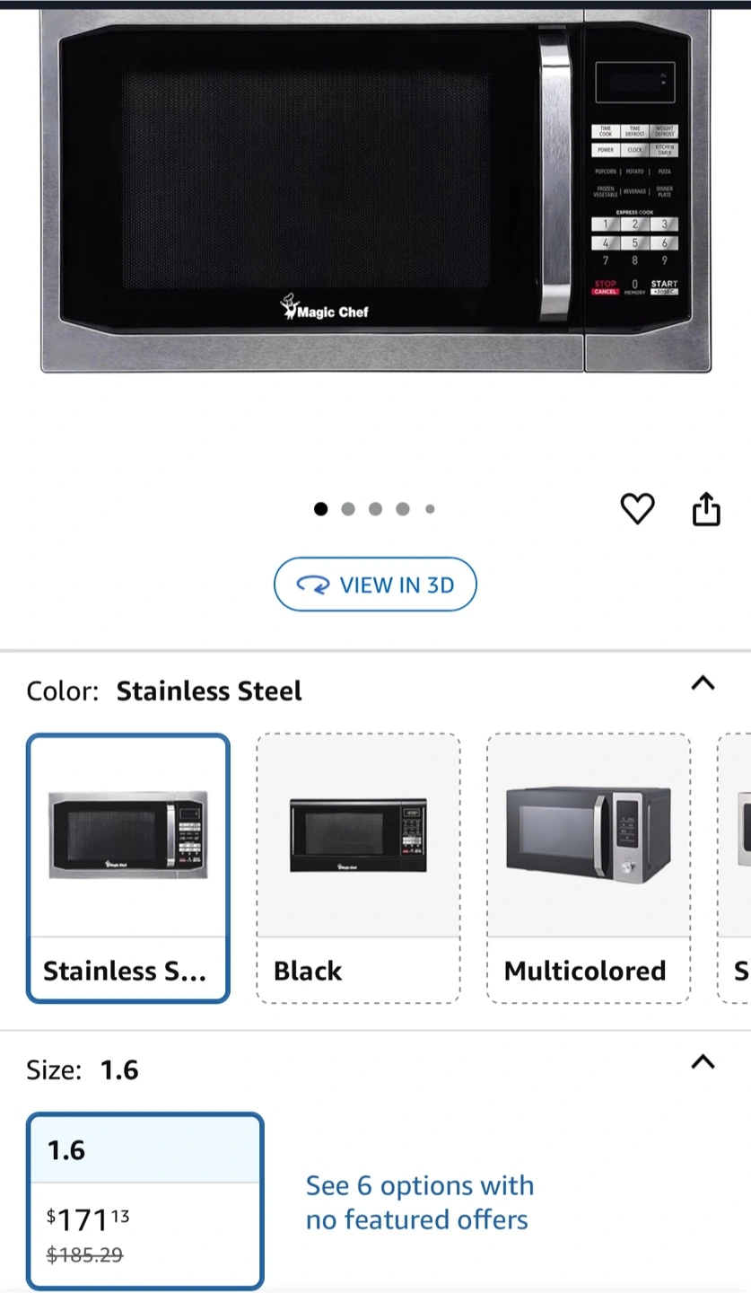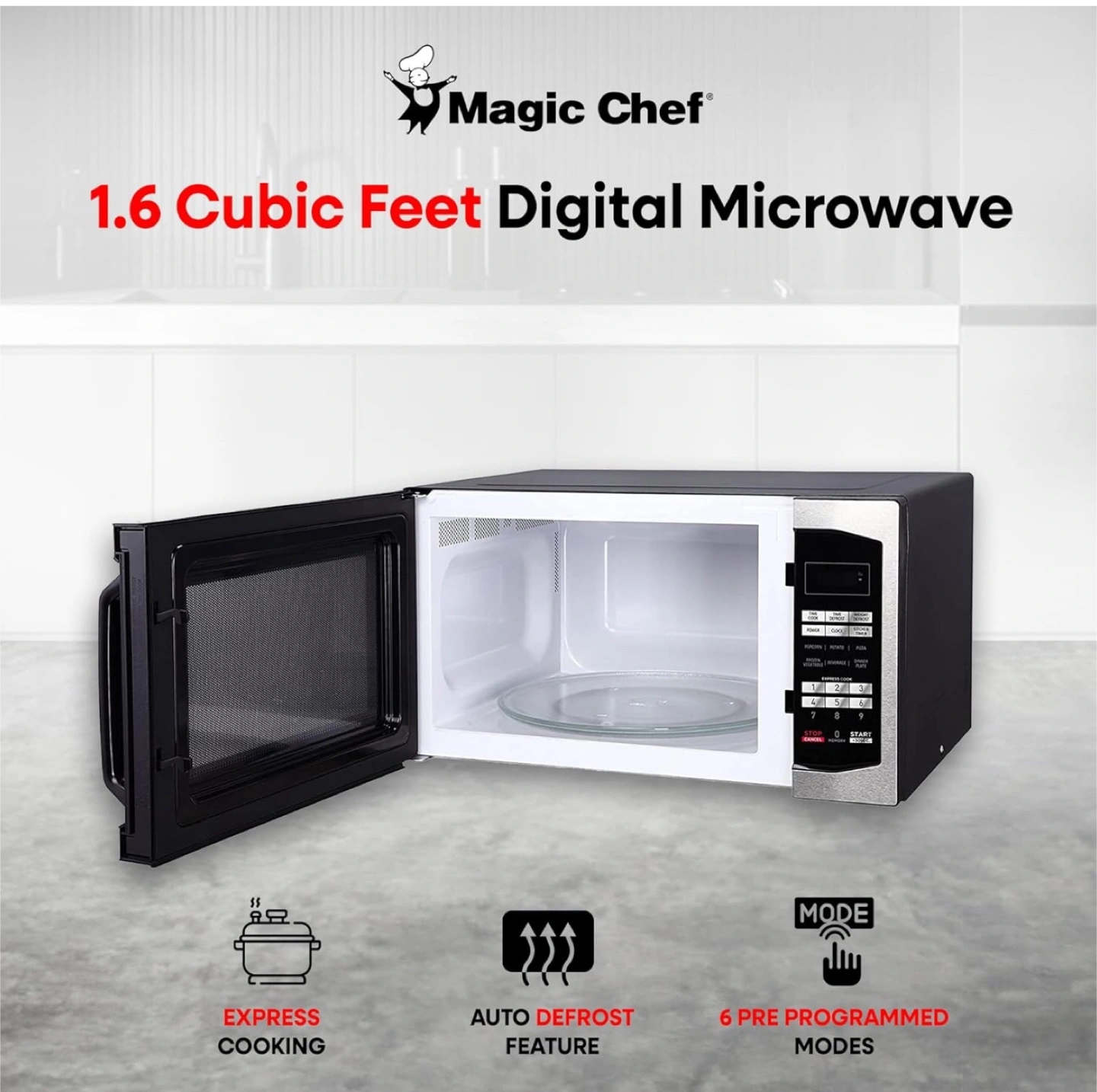 1.6 cubic foot microwave. Digital controls. Auto defrost. Six pre-programmed modes. Express cooking. Stainless steel finish. Great for dorm rooms or kitchens.