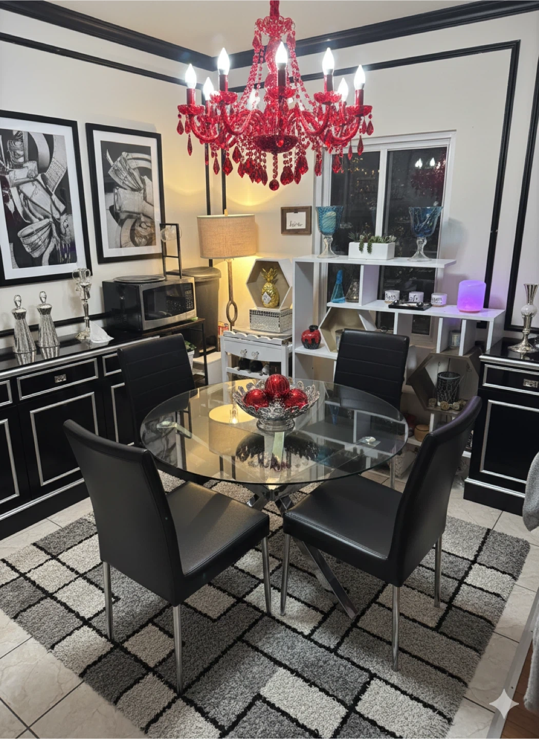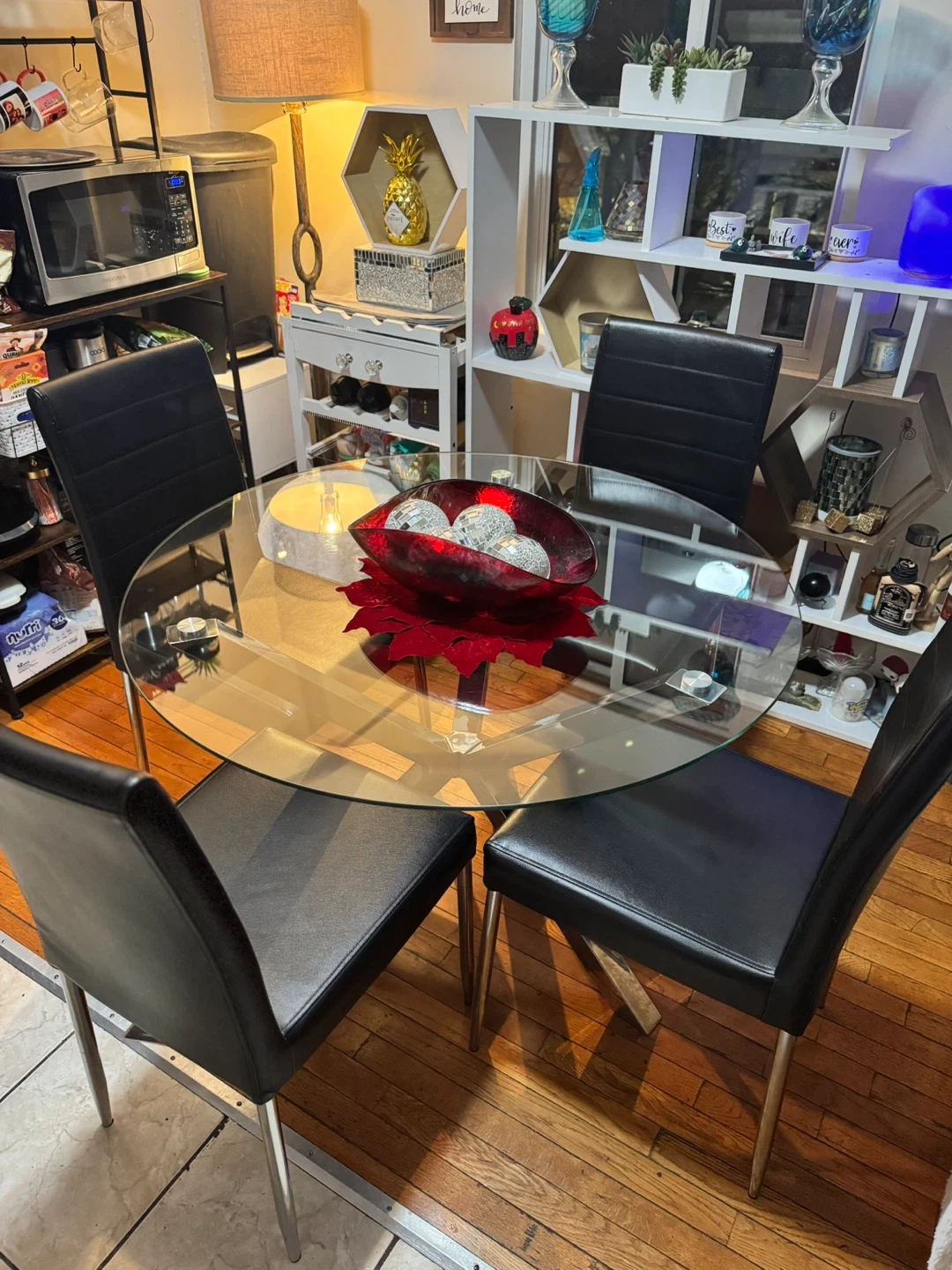 Selling a glass top dining table paired with four sleek black chairs! This set would be a great addition to any dining space. The chairs are comfortable and stylish, complementing the modern look of the glass table. It's in good condition and ready for a new home