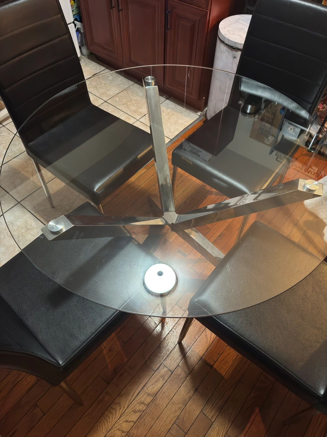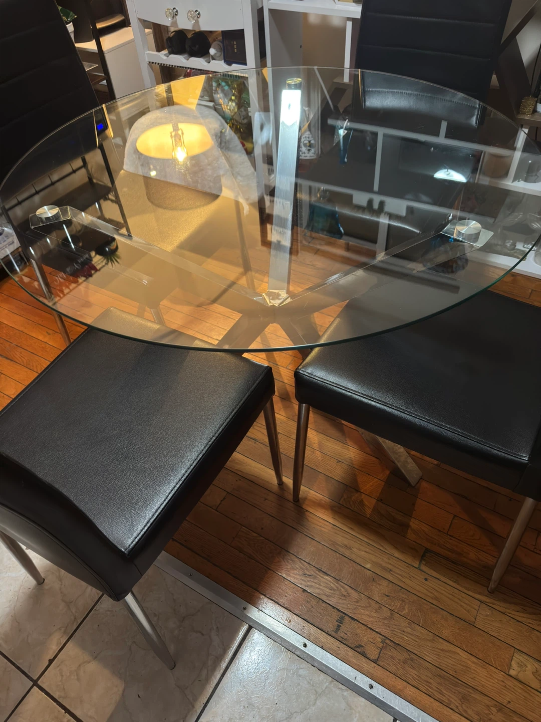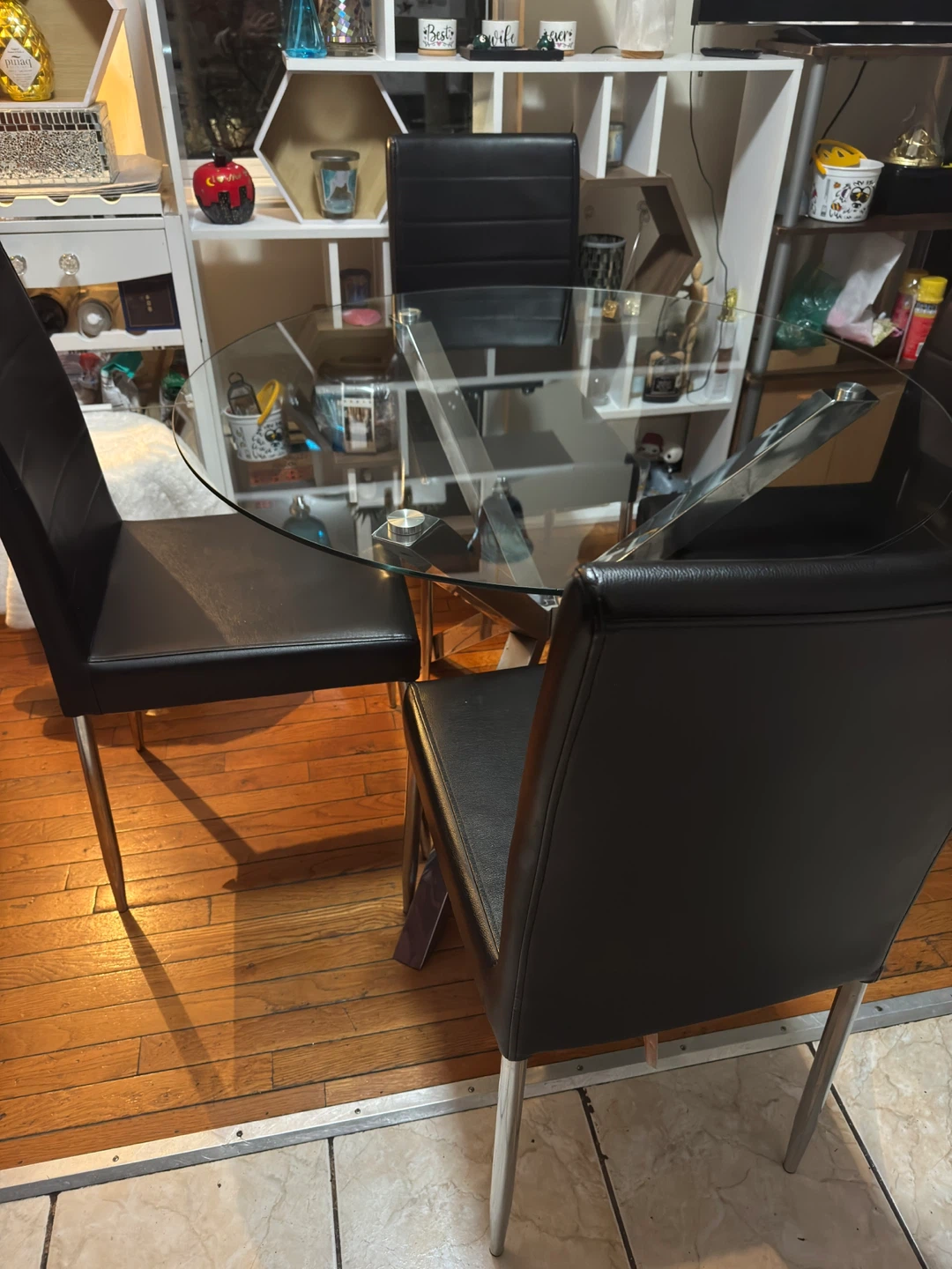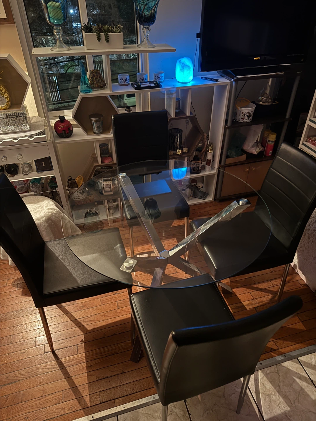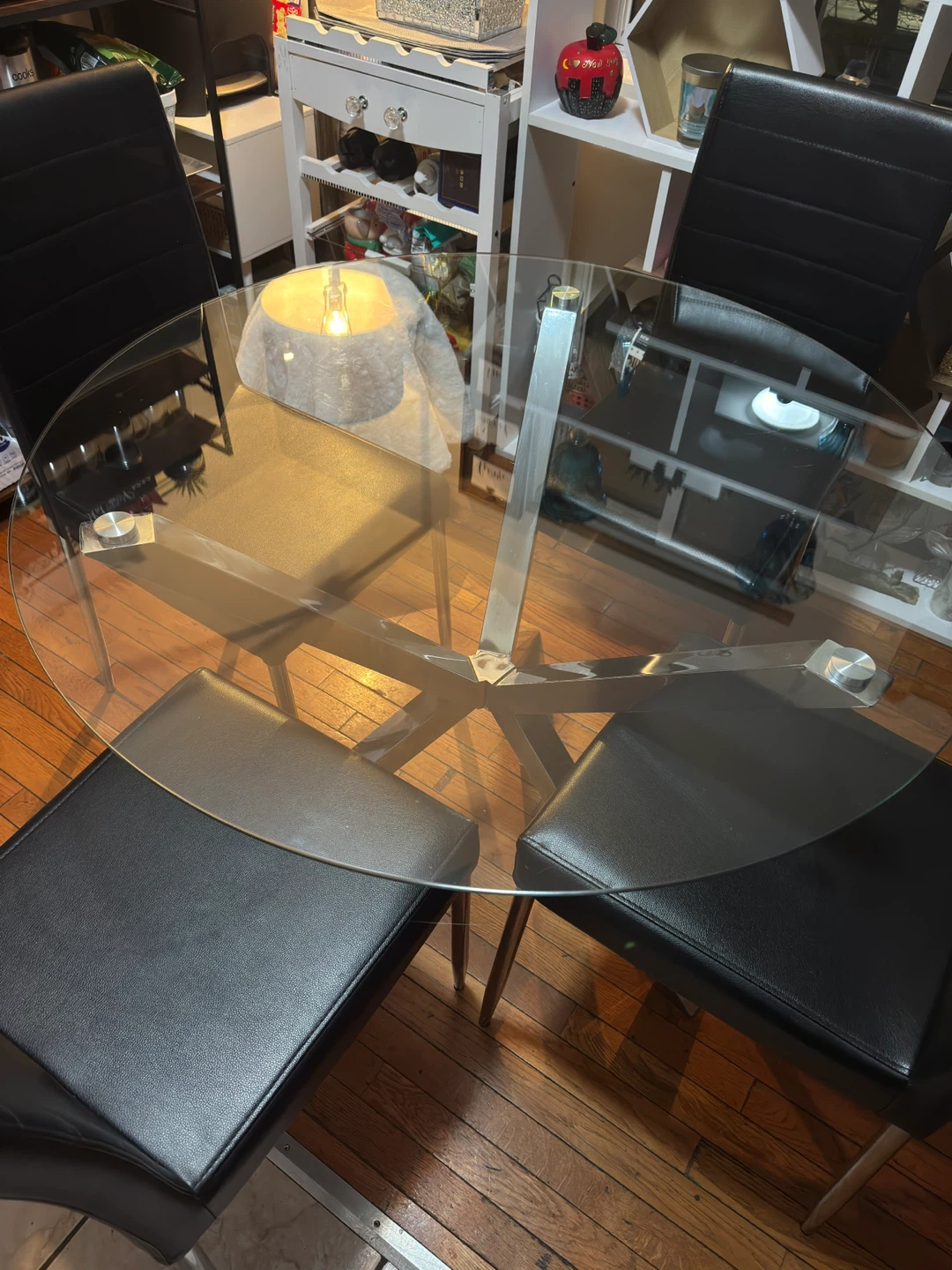 Selling a glass top dining table paired with four sleek black chairs! This set would be a great addition to any dining space. The chairs are comfortable and stylish, complementing the modern look of the glass table. It's in good condition and ready for a new home