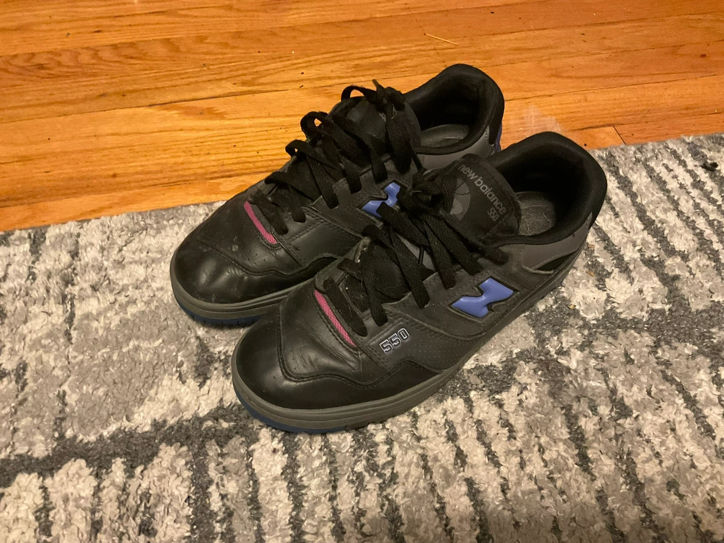 Black New Balance 550 sneakers with blue accents. Leather and synthetic materials. Low-top design.