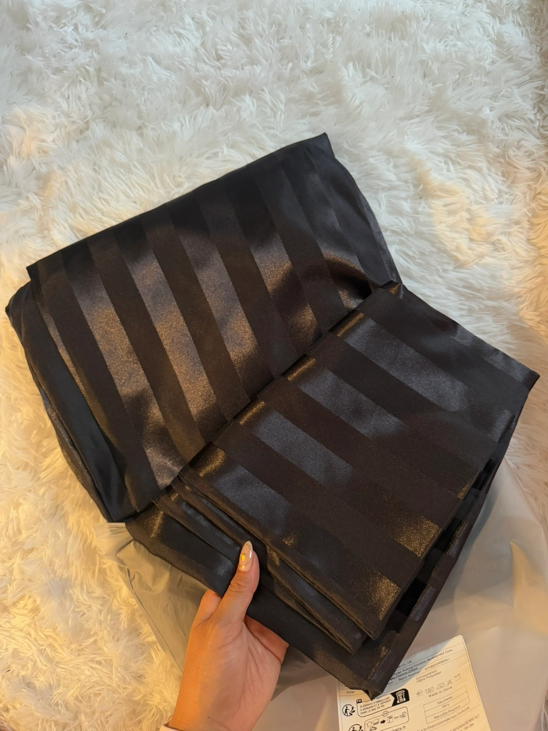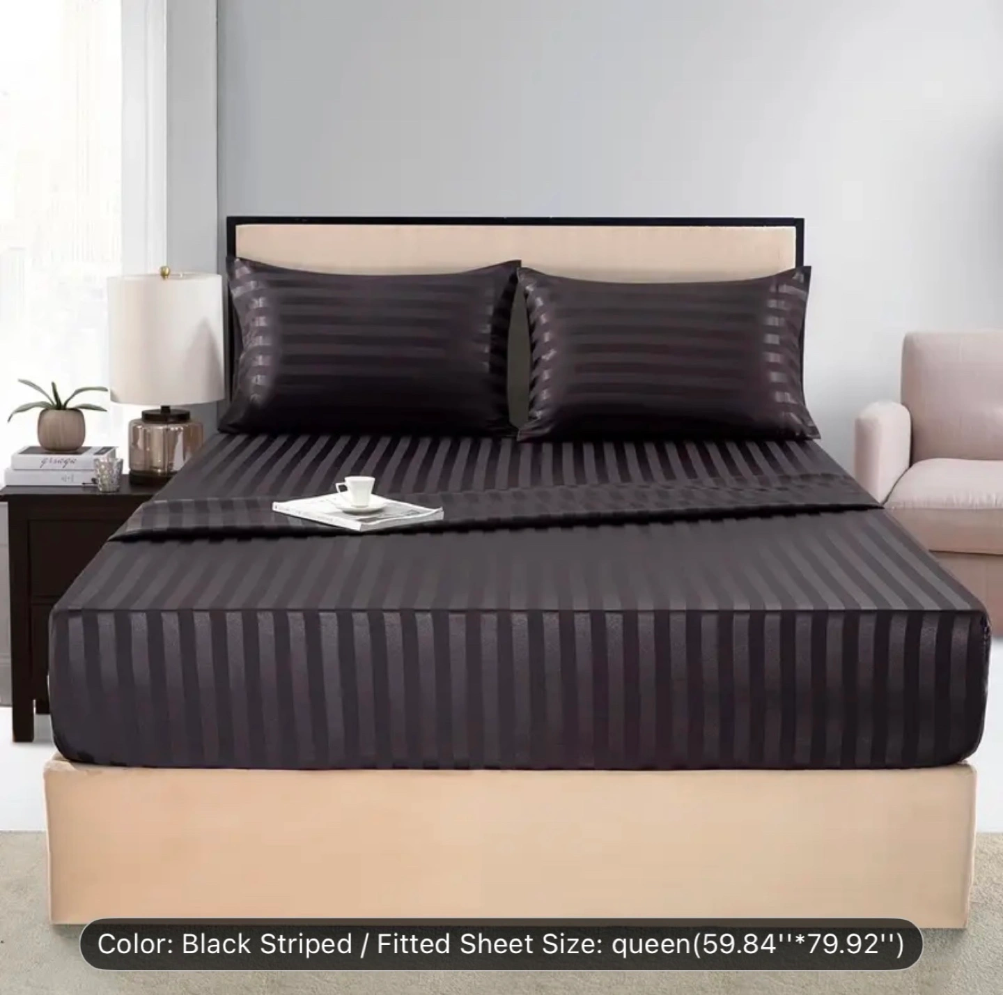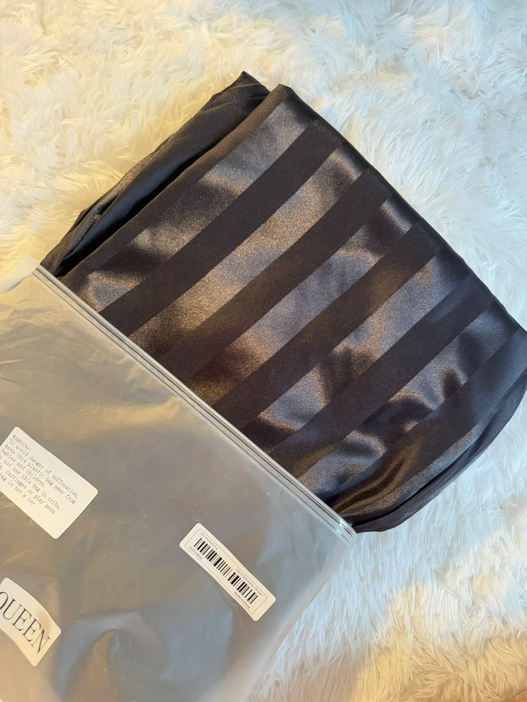 I'm selling a brand new Queen size fitted sheet set! The set is black with a striped pattern. The fitted sheet measures 59.84" x 79.92" (152cm x 203cm). It's still in its original packaging