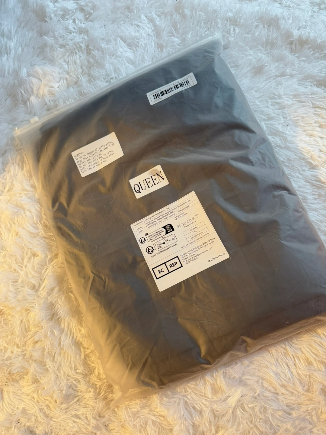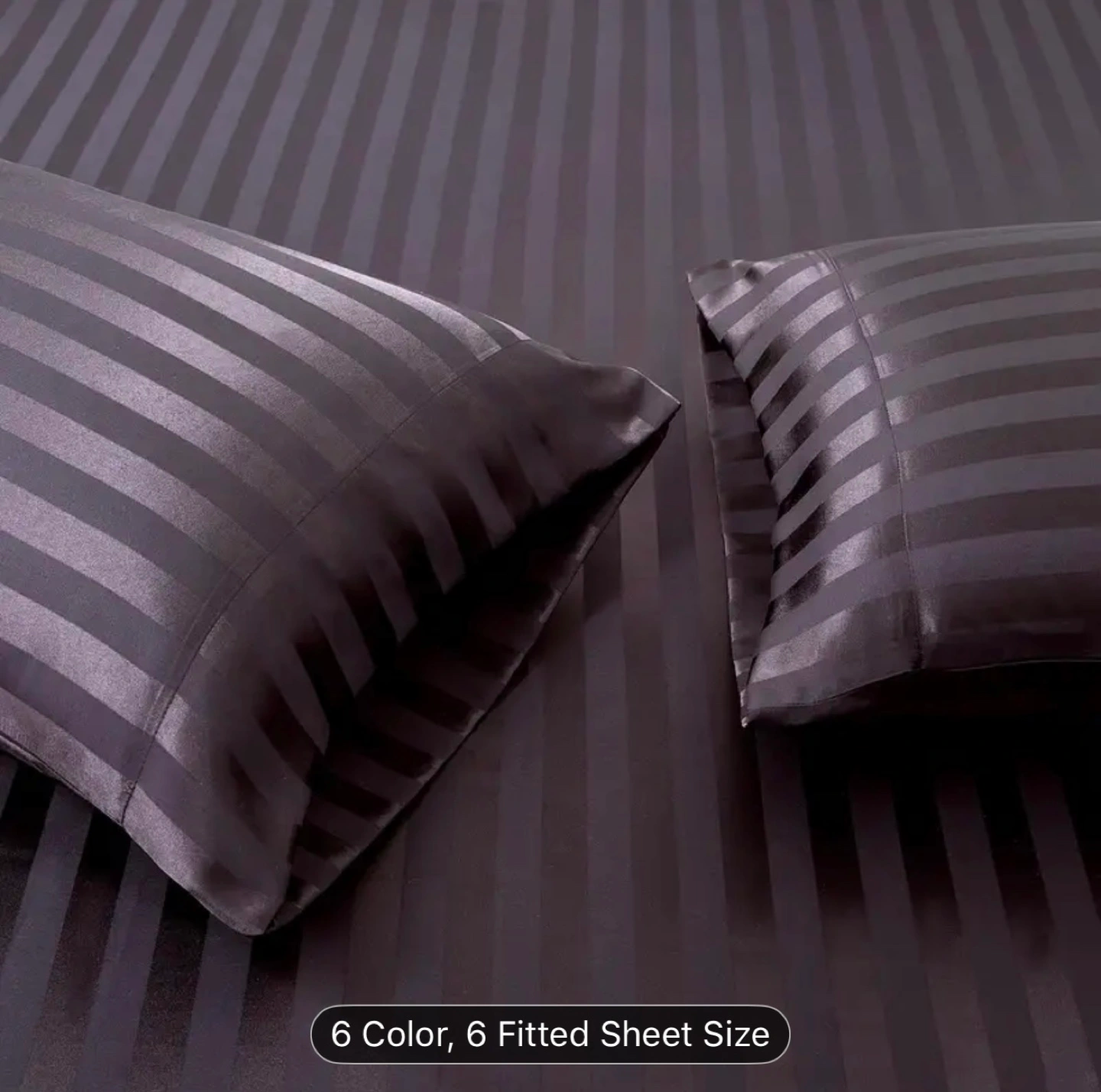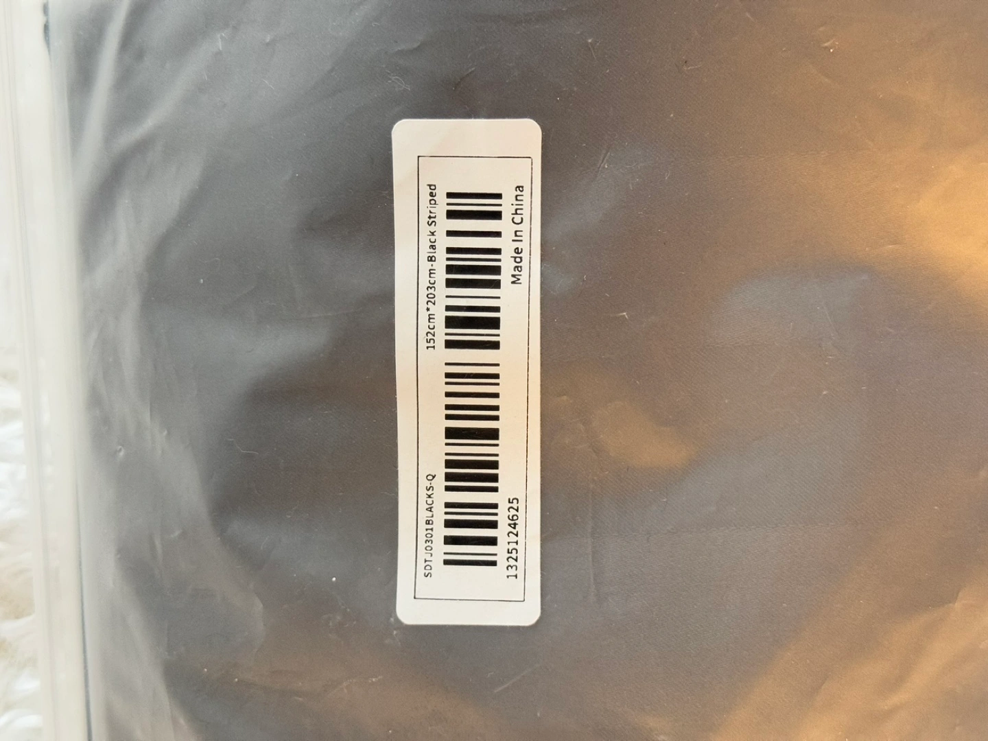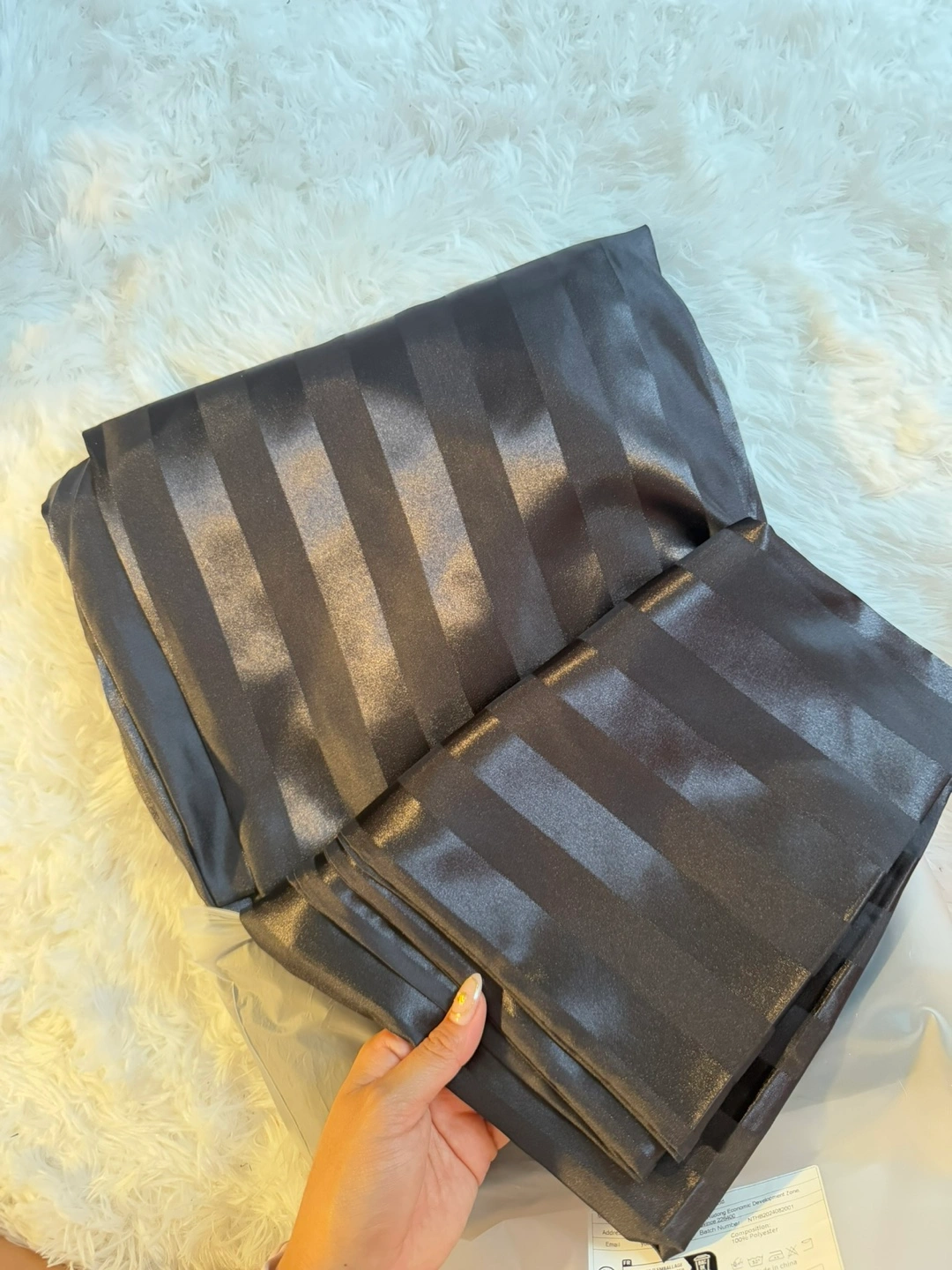 I'm selling a brand new Queen size fitted sheet set! The set is black with a striped pattern. The fitted sheet measures 59.84" x 79.92" (152cm x 203cm). It's still in its original packaging