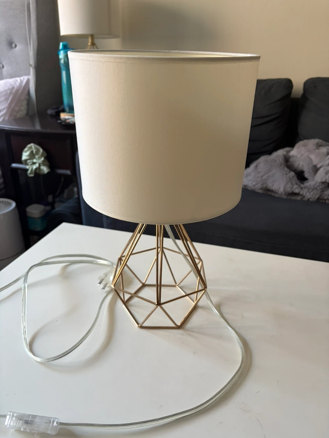 This table lamp features a unique gold geometric base. It has a cream-colored fabric shade. The cord includes an in-line on/off switch. It's a stylish accent piece for any room!