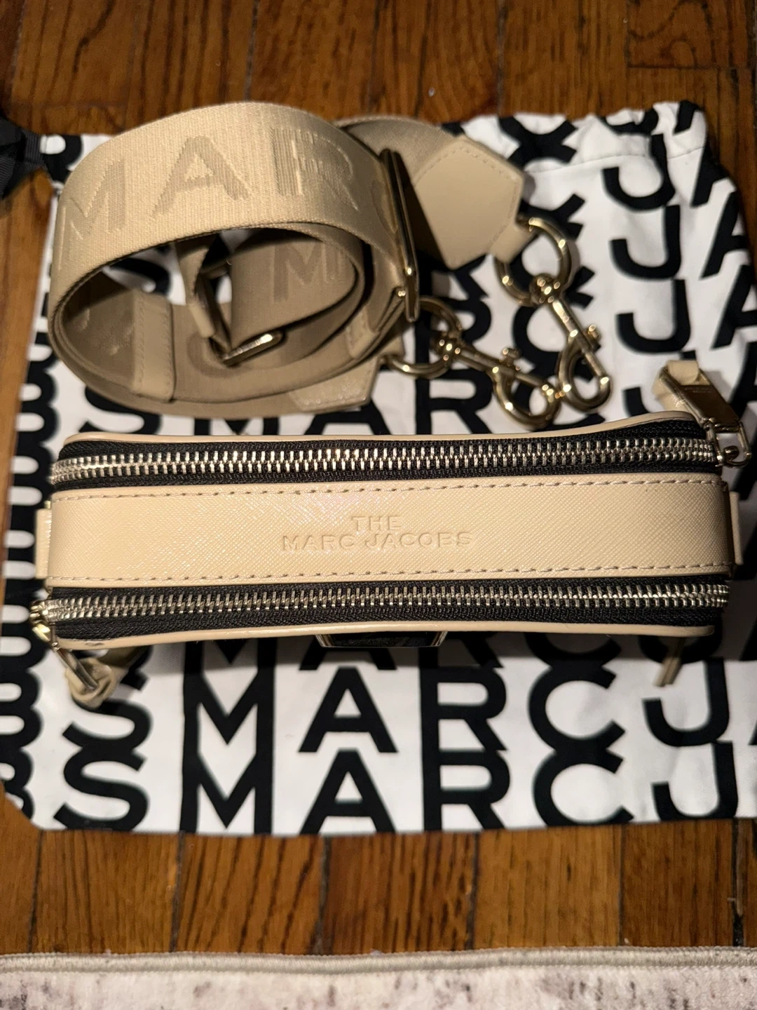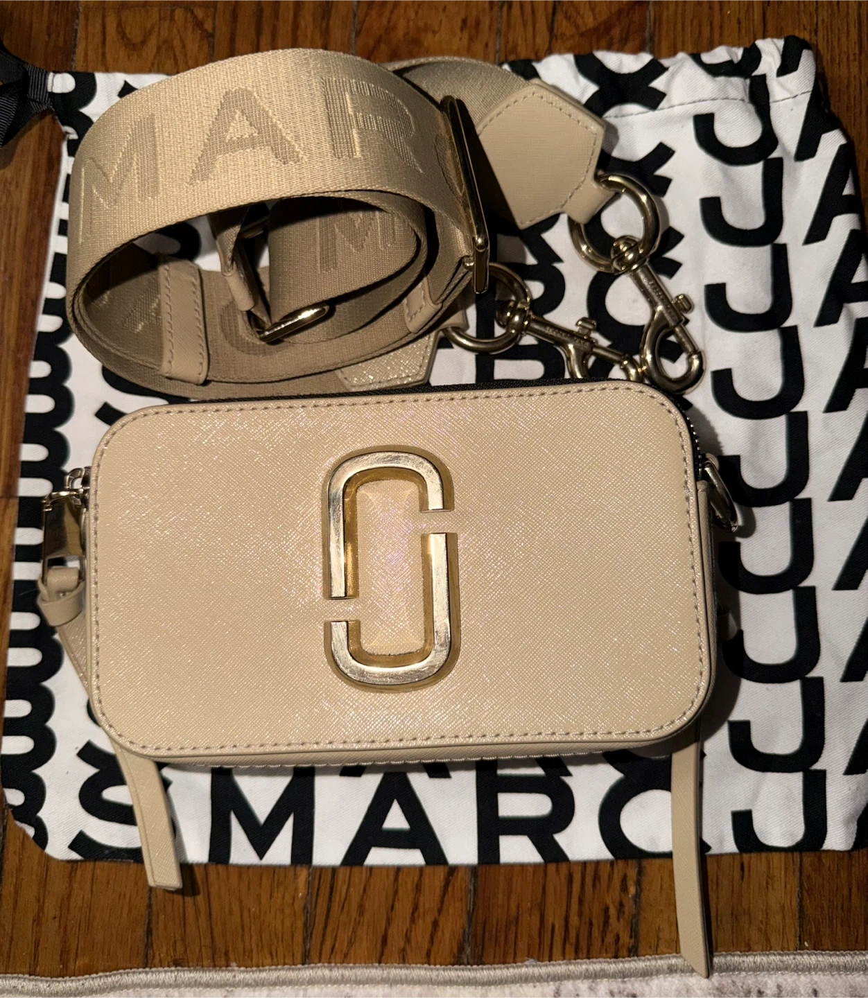 This is a Marc Jacobs Snapshot camera bag. It's made of leather and includes a dust bag. The bag features a gold "J" logo on the front and a removable crossbody strap with "MARC JACOBS" branding.