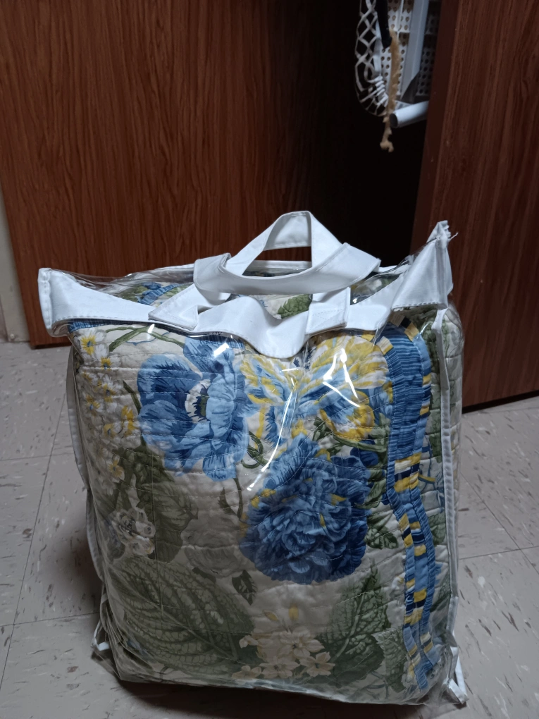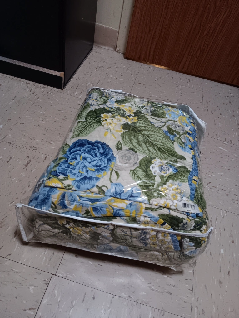 Selling a floral comforter set, still in its original packaging! The comforter features a beautiful blue and yellow floral pattern on a light background. It's perfect for adding a touch of spring to your bedroom. Comes in a clear plastic bag with handles for easy transport