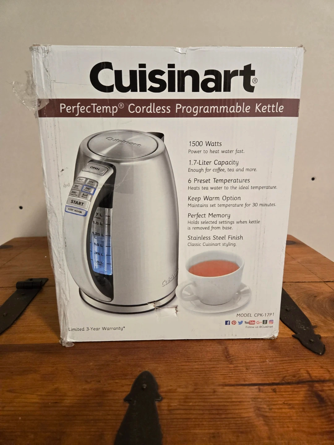 This Cuisinart PerfectTemp Cordless Programmable Kettle offers 1500 Watts of power for fast heating. It has a 1.7-liter capacity and 6 preset temperatures for various beverages. The Keep Warm option maintains temperature for 30 minutes. Stainless steel finish.