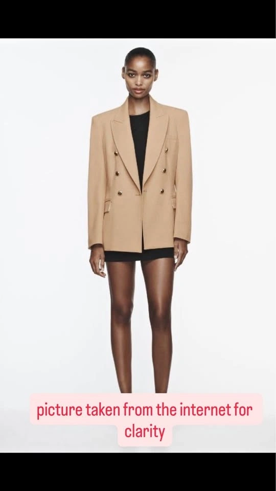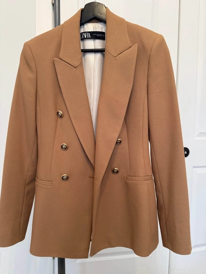 Chic ZARA structured blazer in camel/tan color with double-breasted front and gold buttons. Fully lined, great for office, meetings, or smart casual looks.