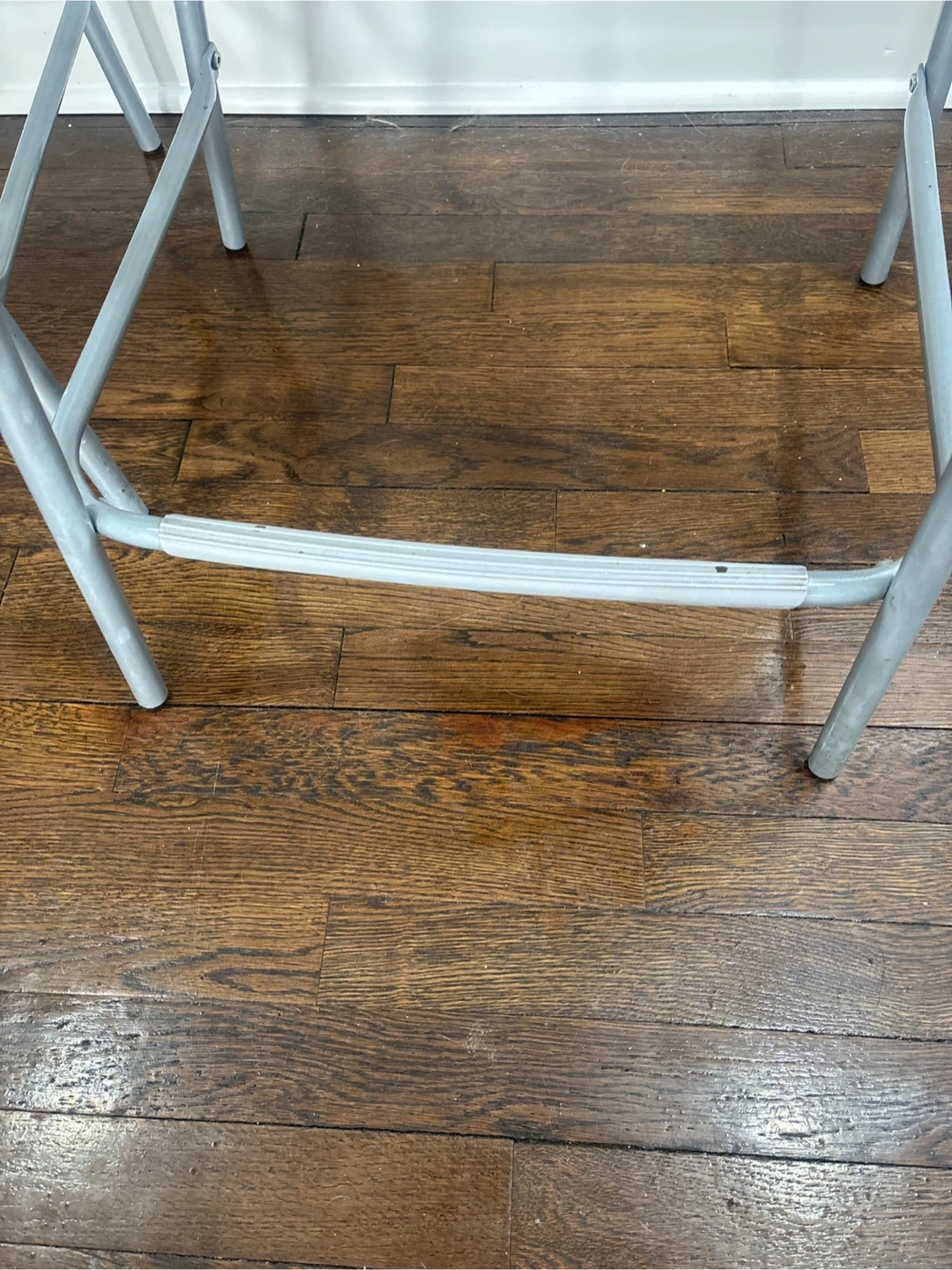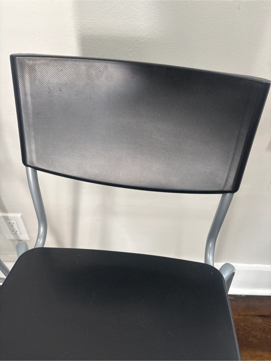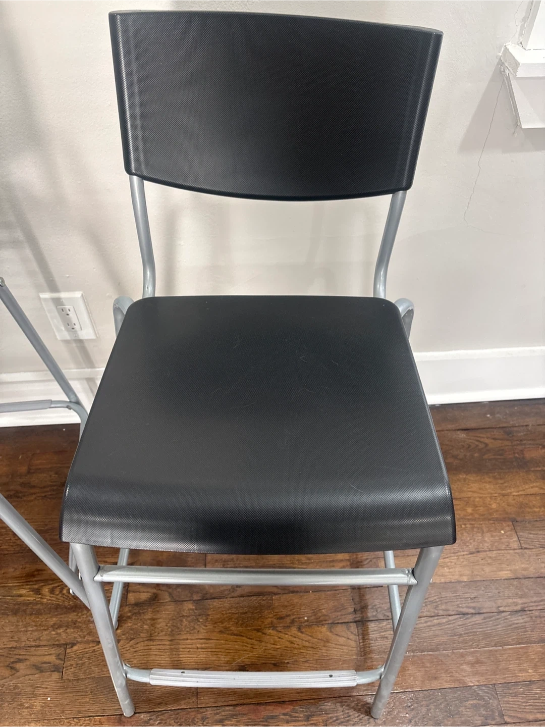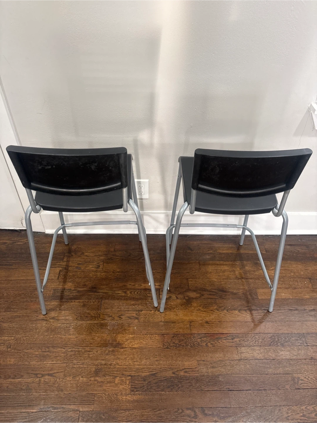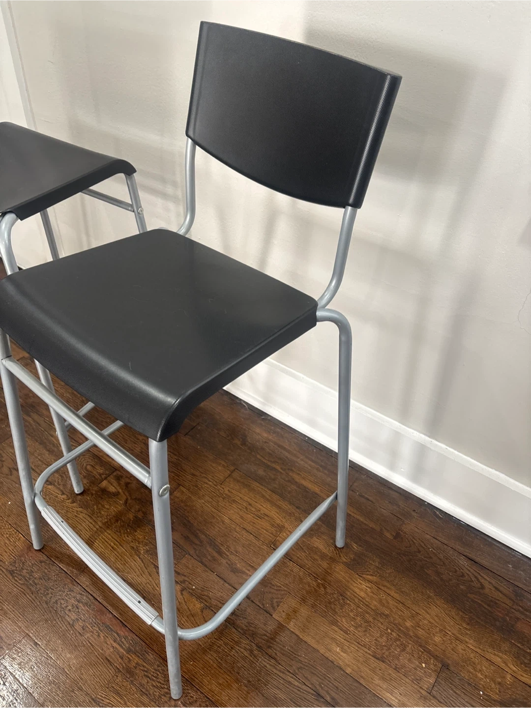 These are two black bar stools with silver metal legs. They feature a sleek, modern design that complements many kitchen or bar areas. Their sturdy construction makes them a practical seating option.