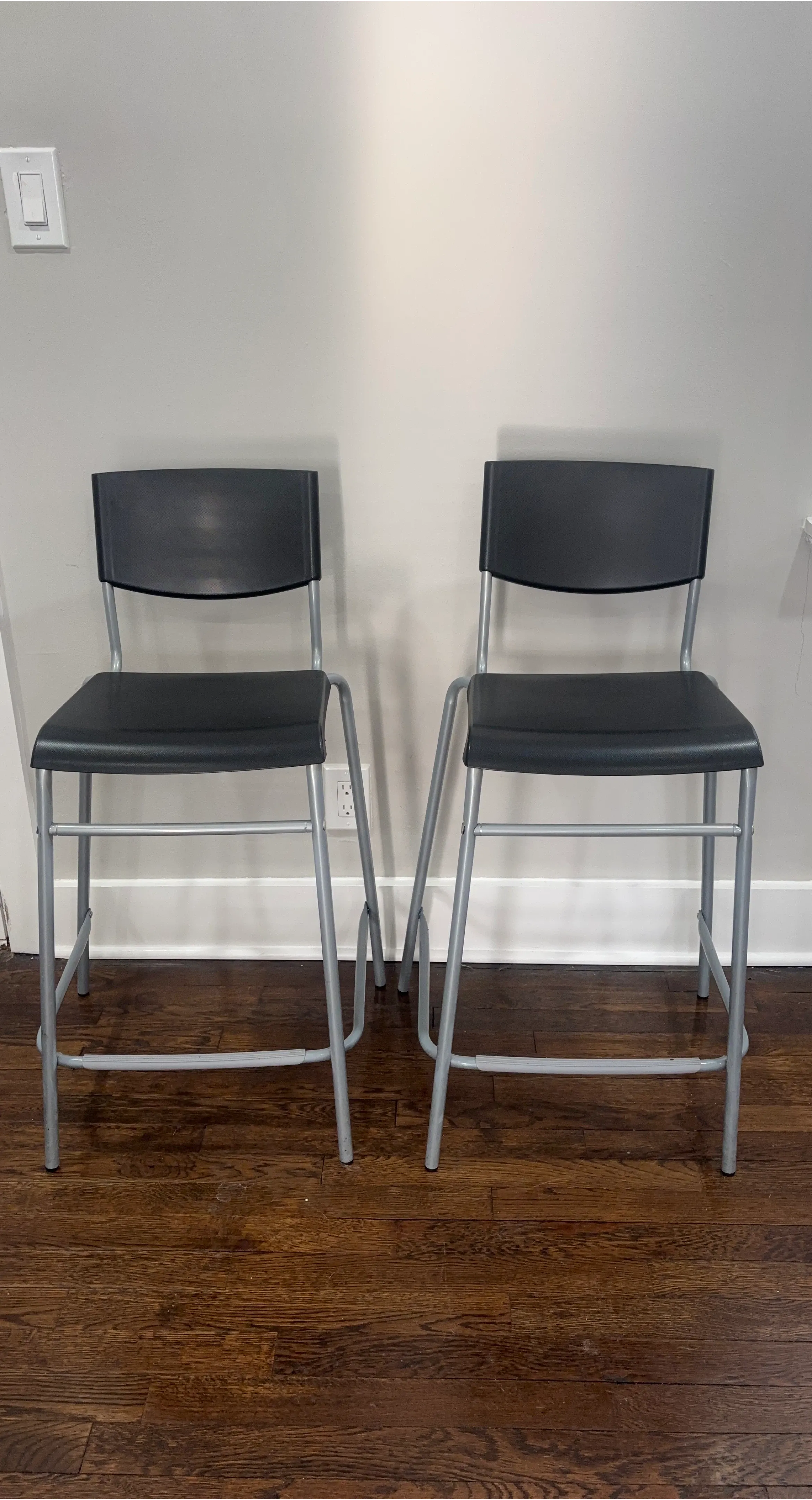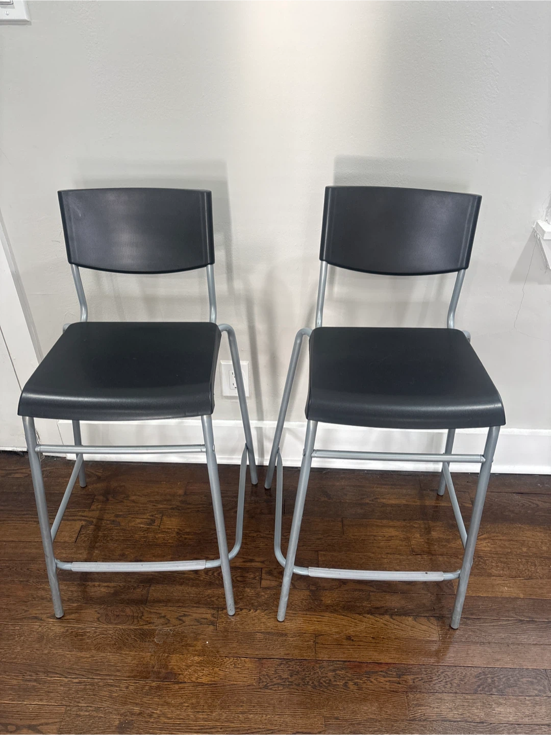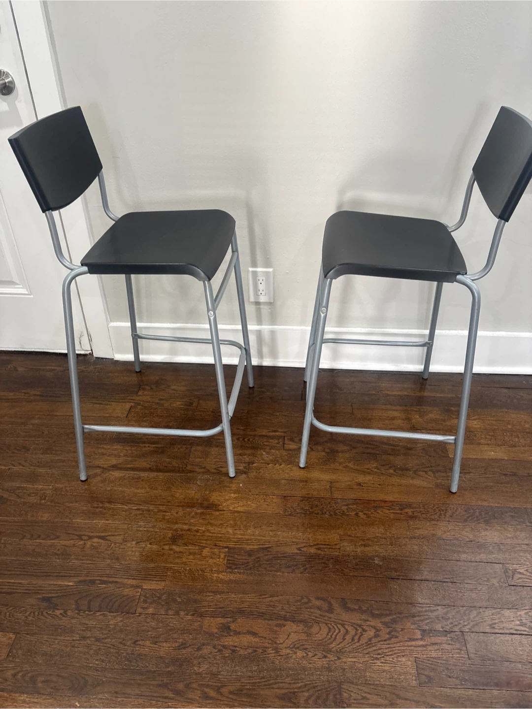 These are two black bar stools with silver metal legs. They feature a sleek, modern design that complements many kitchen or bar areas. Their sturdy construction makes them a practical seating option.