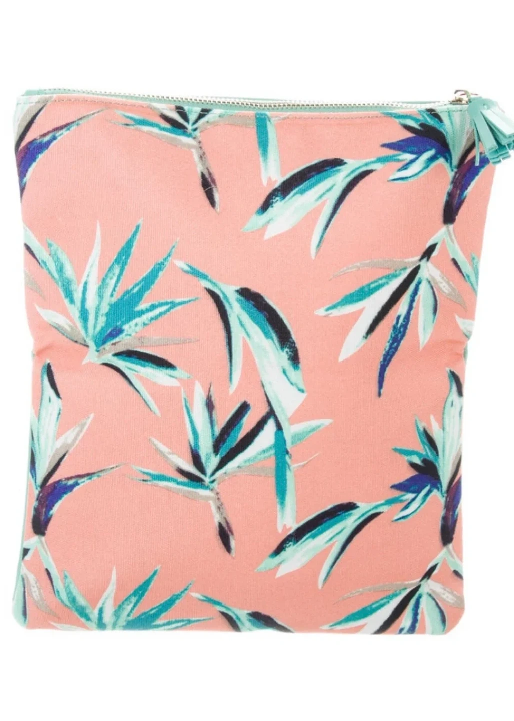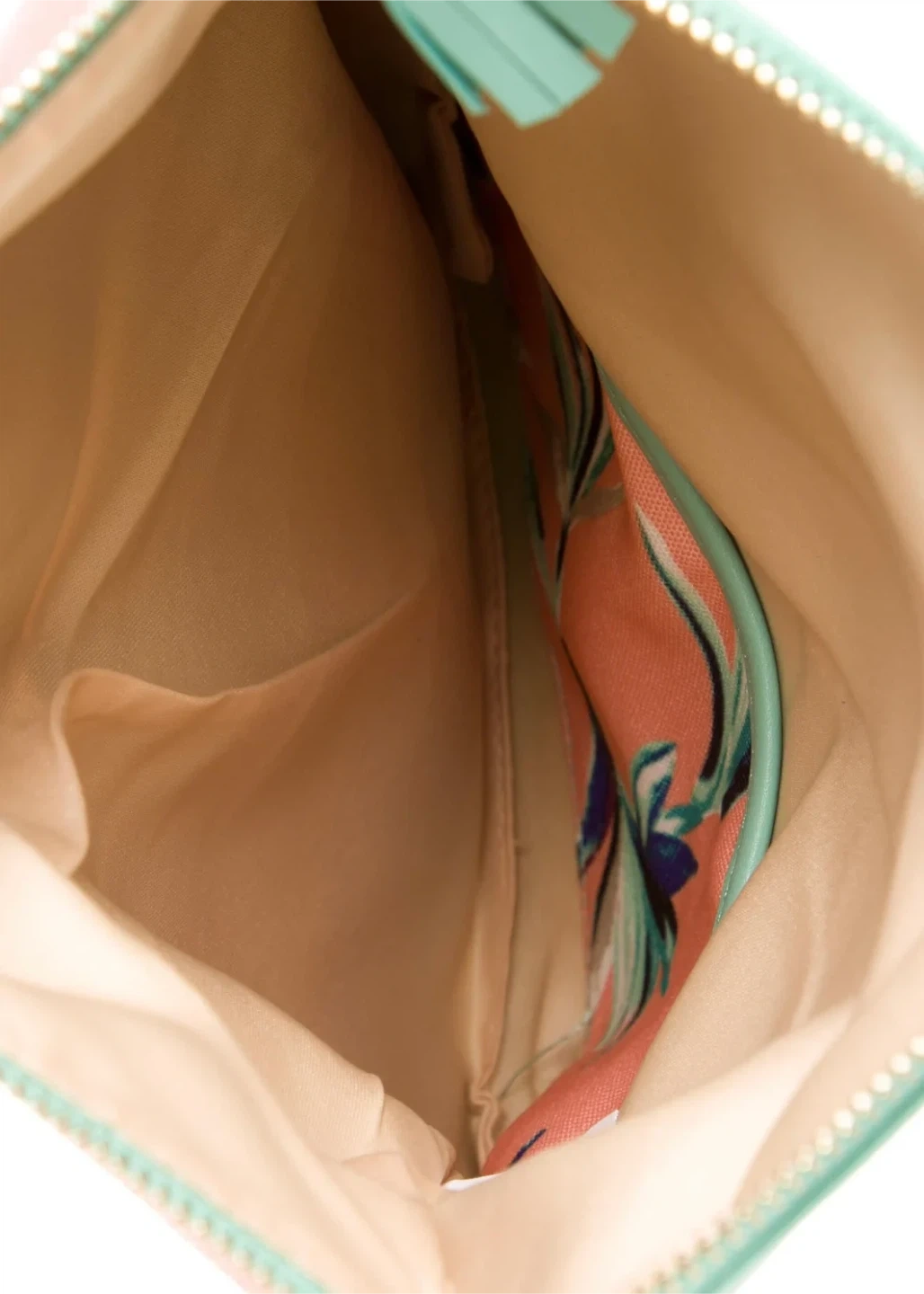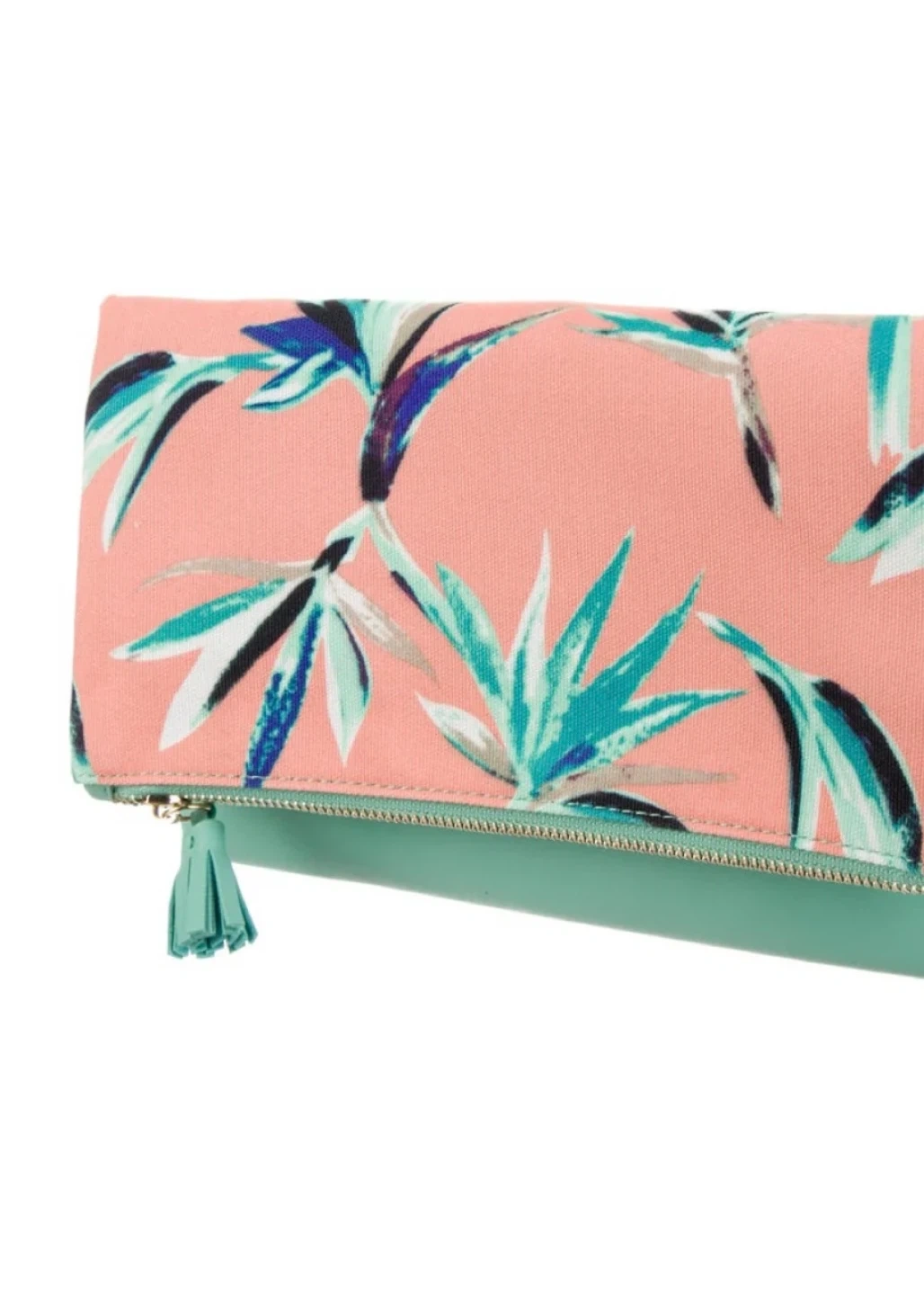 20Brand new Cute floral print clutch with a mint green bottom and tassel detail! It's perfect for a night out or a special occasion. The Basics: Color: Multi (Mint & Pink); Size: OS Condition: New Product Details: Reversible pink palm-printed canvas with mint leather Gold-tone hardware Satin lining Single interior pocket Exposed tassel zip closure Height: 11" Width: 10" Depth: 0.5"