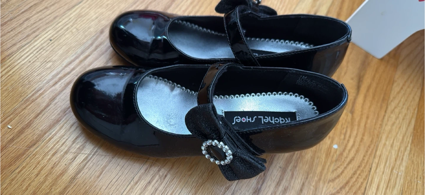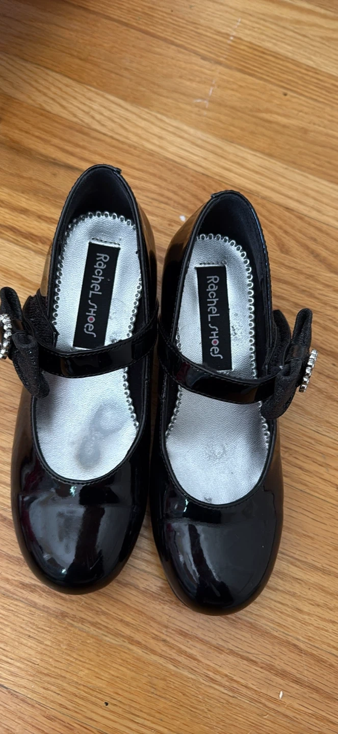 These are a cute pair of black patent leather shoes from Rachel Shoes! They are a girls size 1M and have a bow detail on the top. They are in good condition!