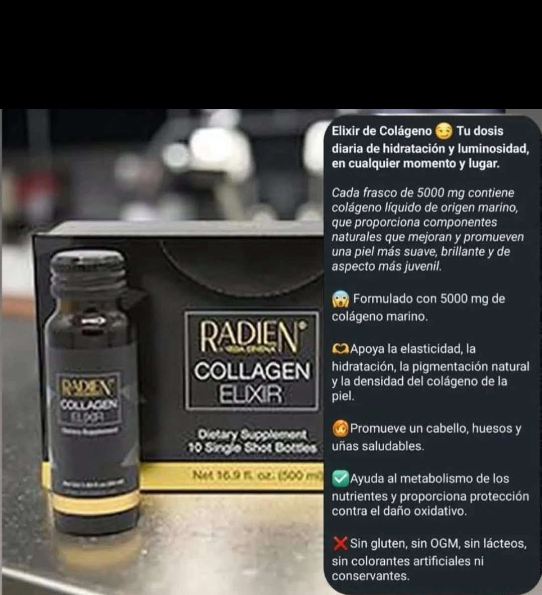 5This is a Radien Collagen Elixir dietary supplement. Each bottle contains 5000 mg of marine collagen. It supports elasticity, hydration, pigmentation, and collagen density of the skin. It also promotes healthy hair, bones, and nails and helps with nutrient metabolism