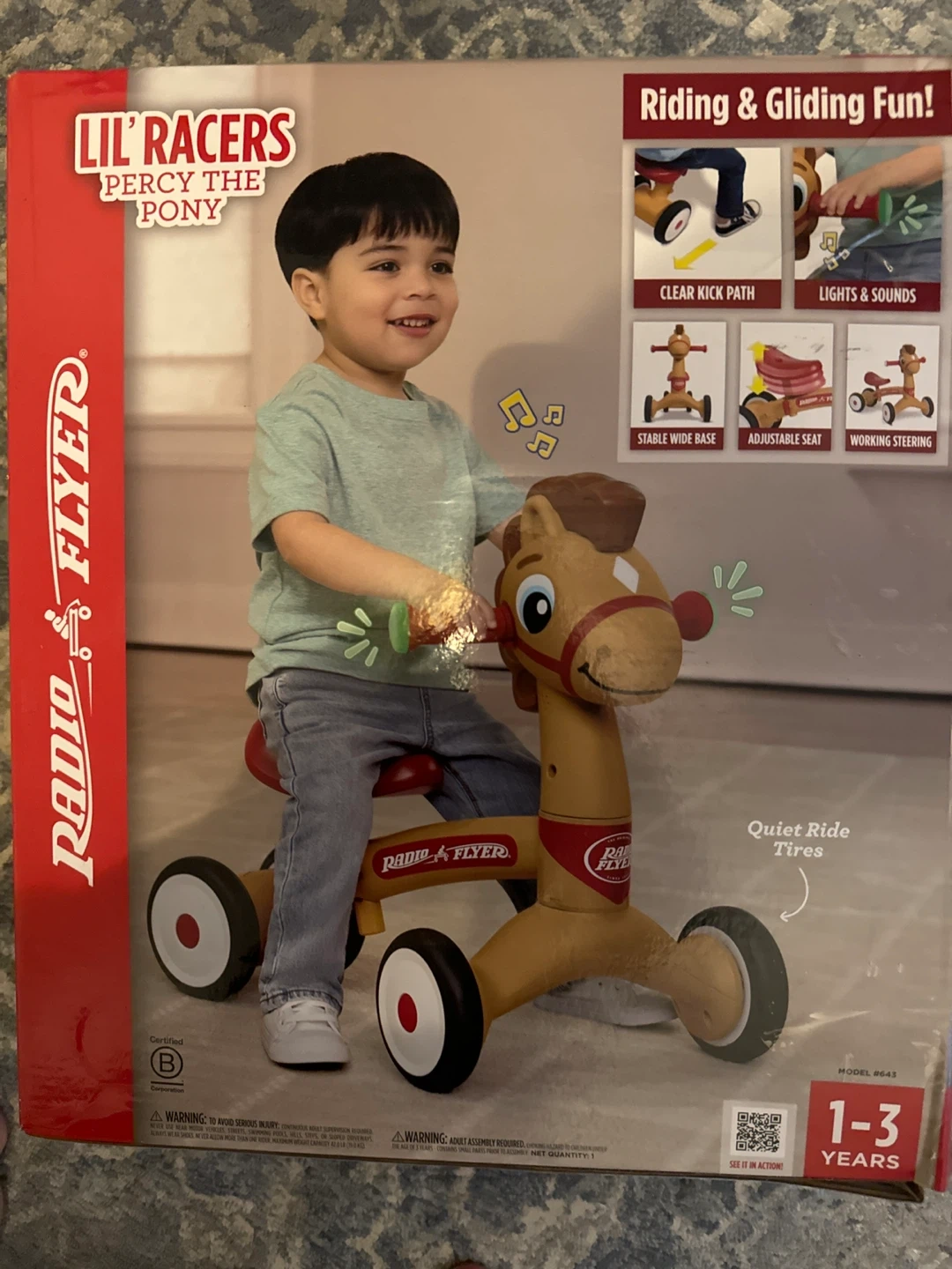 Get ready for riding and gliding fun with this Radio Flyer Lil' Racers Percy the Pony! It features a stable wide base, adjustable seat, and working steering. Plus, it has lights and sounds and quiet ride tires! Recommended for ages 1-3 years