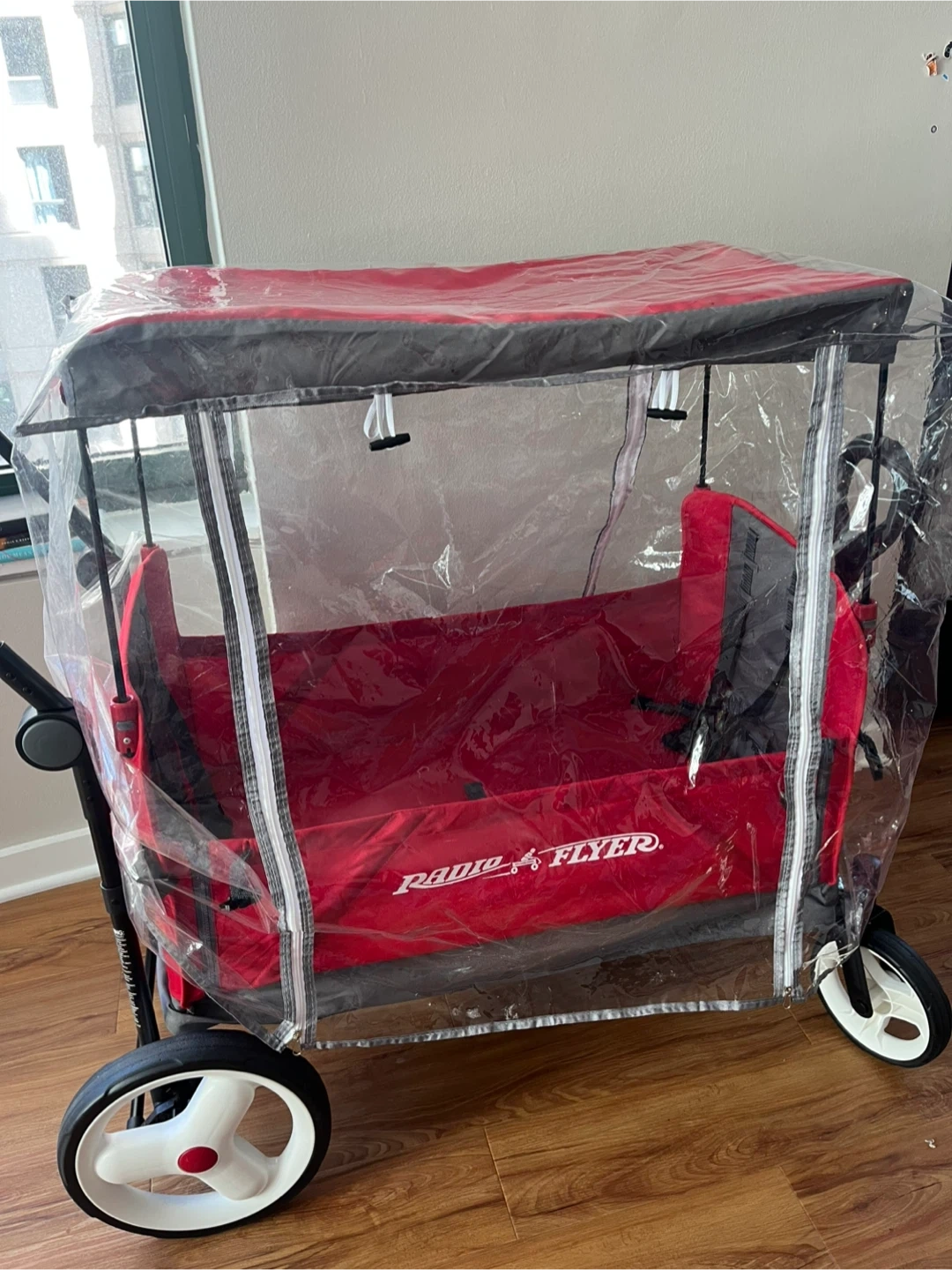 Selling a red Radio Flyer wagon, perfect for kids! It comes with a canopy to protect from the sun or light rain. It's in good condition and ready for new adventures!