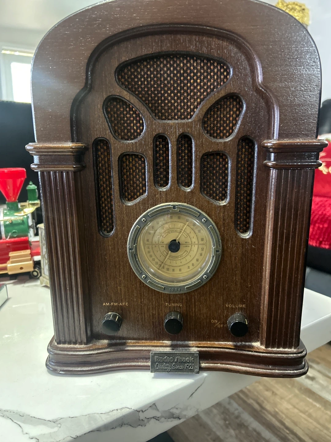 10Selling a vintage-style radio from Radio Shack! It has a classic look with AM/FM/AFC tuning. The design includes a tuning dial and volume control. It would be a great addition to any room for a touch of nostalgia