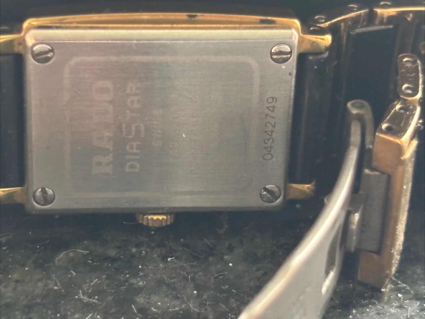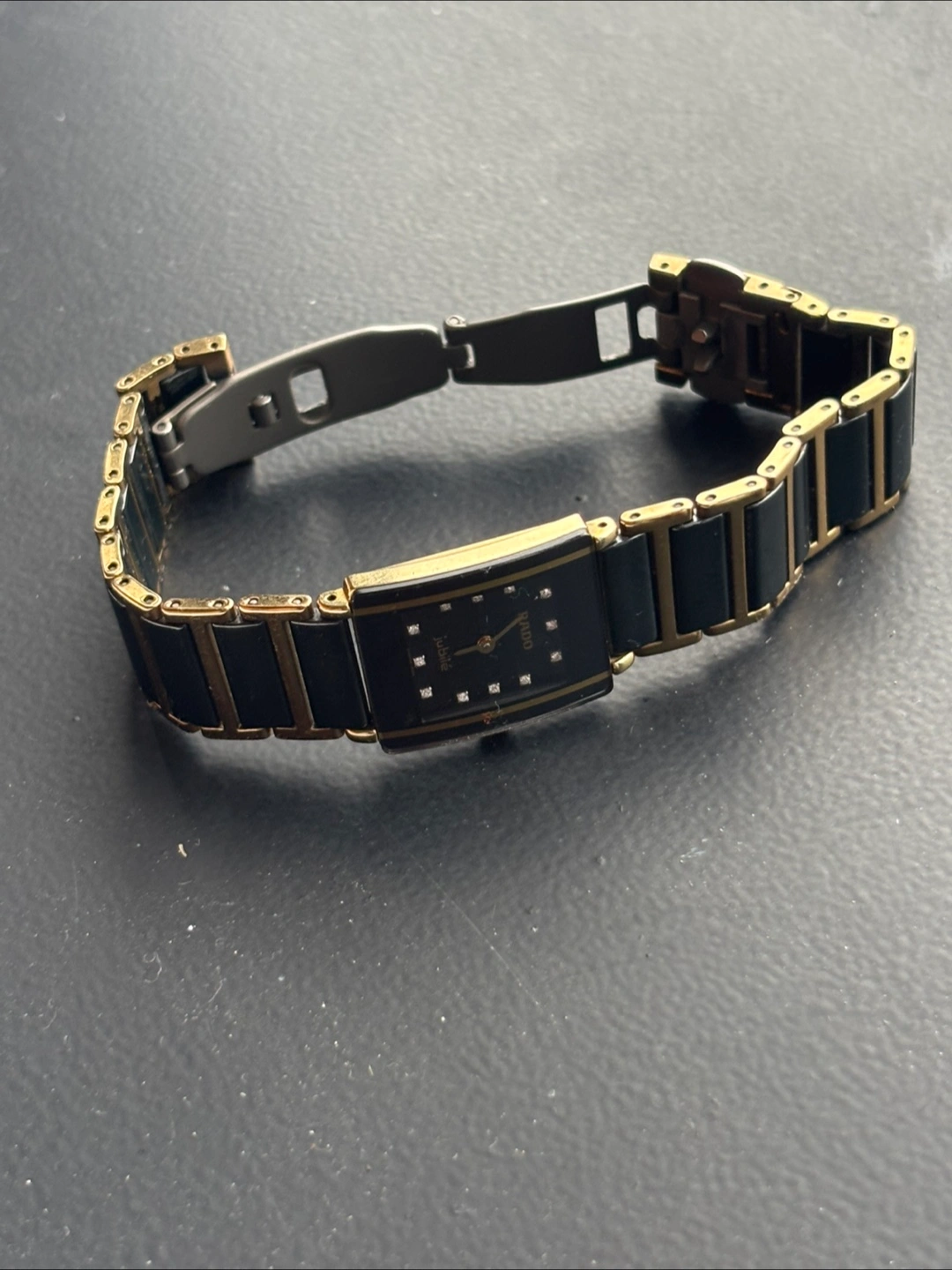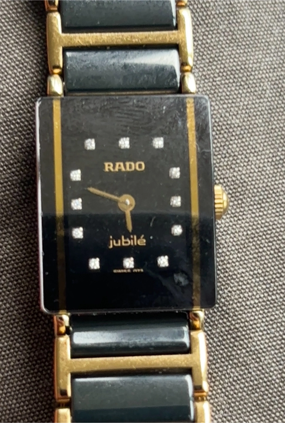 Selling a Rado Diastar Jubile women's watch. It features a black and gold design. The model number is 04342749. It is in good condition!
