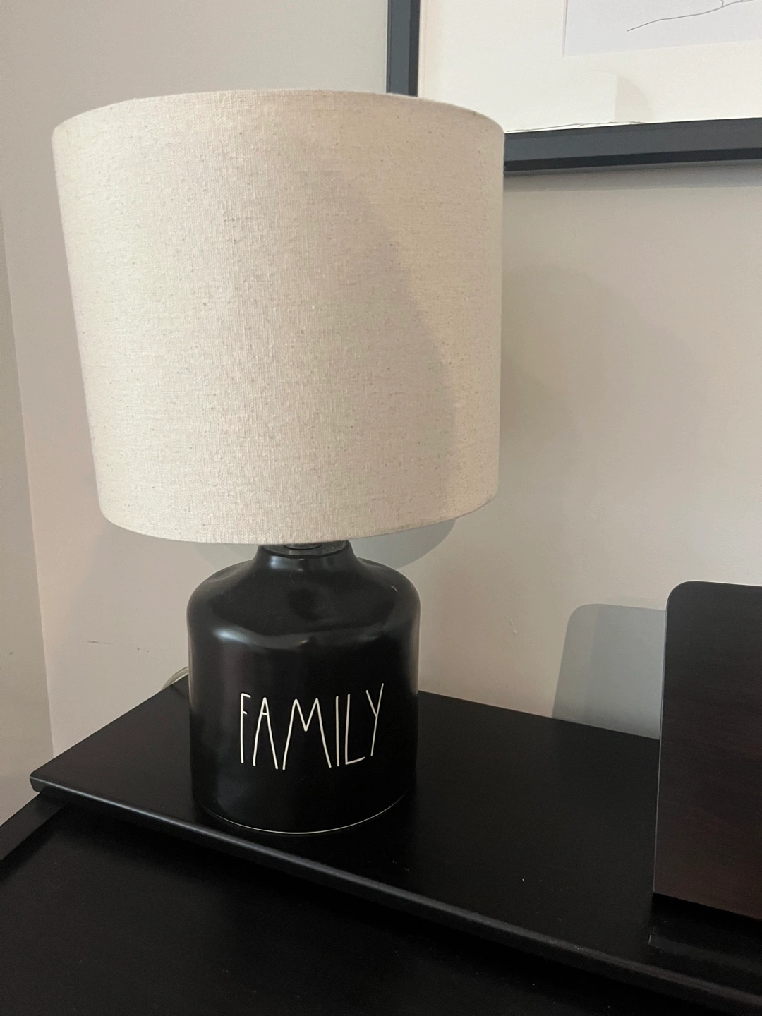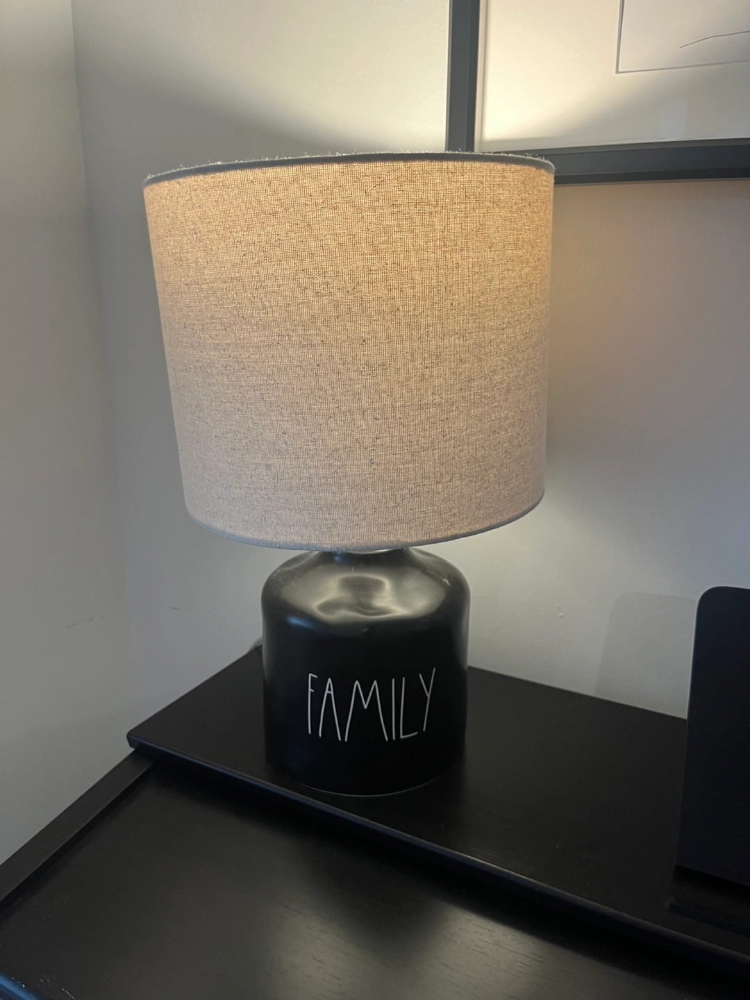 I'm selling a Rae Dunn table lamp! It has a black base with the word 'FAMILY' written on it and a neutral-colored lampshade. This lamp would be a cozy addition to any room
