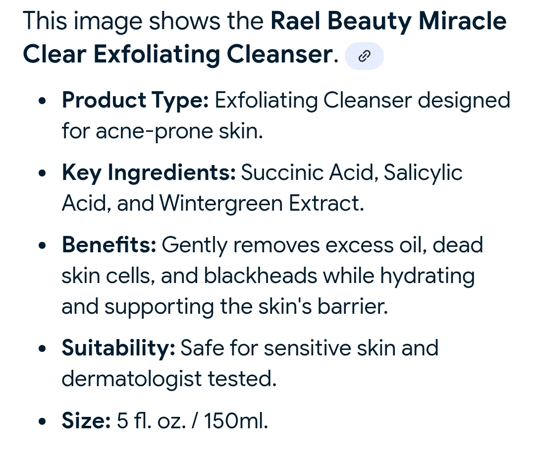 I'm selling a Rael Beauty Miracle Clear Exfoliating Cleanser! It's designed for oily and acne-prone skin and helps with clogged pores. Key ingredients include Succinic Acid, Salicylic Acid, and Wintergreen Extract. It gently removes excess oil, dead skin cells, and blackheads while hydrating and supporting the skin's barrier. It's safe for sensitive skin and dermatologist tested! Size: 5 fl oz / 150ml Pick up in Naperville near naper blvd and 87th street or near downtown Naperville off of Chicago and Charles