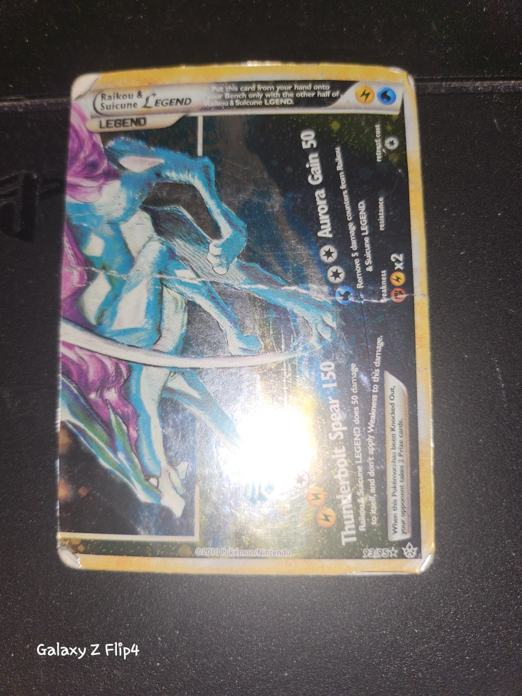 Selling a Raikou & Suicune LEGEND Pokemon card! It's from the LEGEND series, as seen on the card. This card allows you to put it from your hand onto your Bench only with the other half of Raikou & Suicune LEGEND. It has an Aurora Gain of 50, which removes 5 damage counters from Raikou & Suicune LEGEND. The Thunderbolt Spear does 150 damage, but Raikou & Suicune LEGEND also does 50 damage to itself, and don't apply Weakness to this damage. When this Pokémon has been Knocked Out, your opponent takes 2 Prize cards. Card number is 93/95.