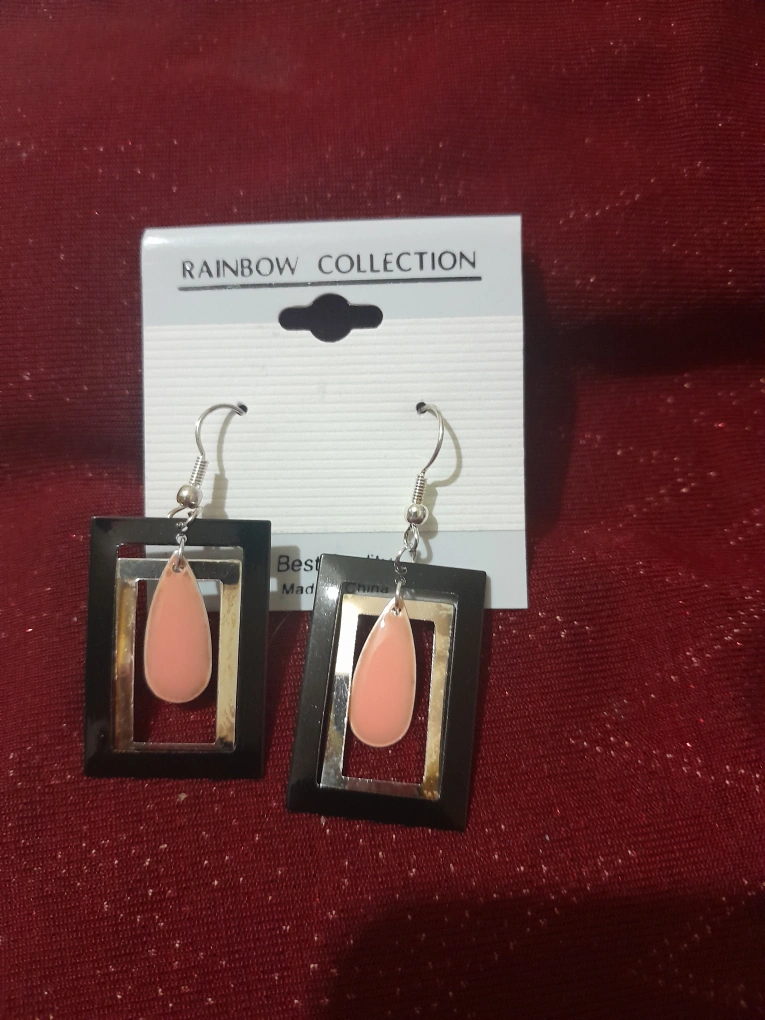 These are a pair of drop earrings from Rainbow Collection. They feature a rectangular frame in black and silver, with a peach-colored teardrop shape inside. Perfect for adding a pop of color to your outfit!