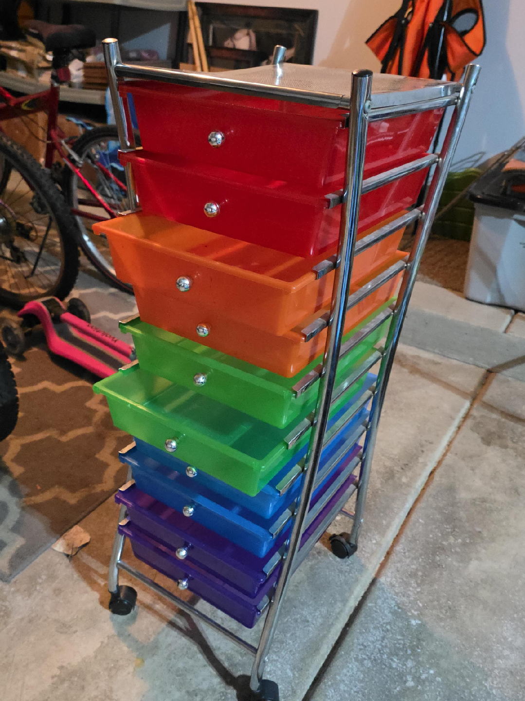 Here's a colorful rolling storage cart! It features a chrome frame and rainbow-colored drawers (red, orange, green, blue, and purple). Perfect for organizing your craft supplies, toys, or office essentials