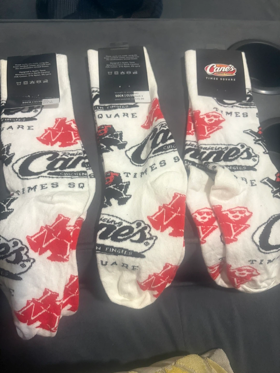 I'm selling a set of Raising Cane's Times Square socks. They are made of 75% Cotton, 21% Nylon, and 4% Lycra. These socks are designed in Austin and manufactured in North Carolina. Originally, I bought these for $15.99