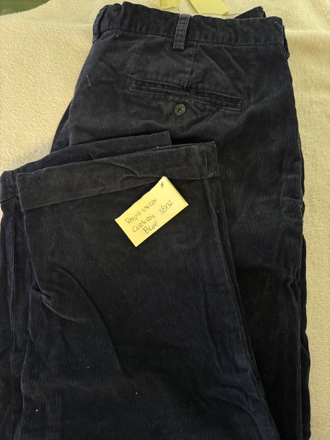 10Selling a pair of Ralph Lauren corduroy pants in size 38x32. They're a nice blue color and in good condition! Perfect for a casual look