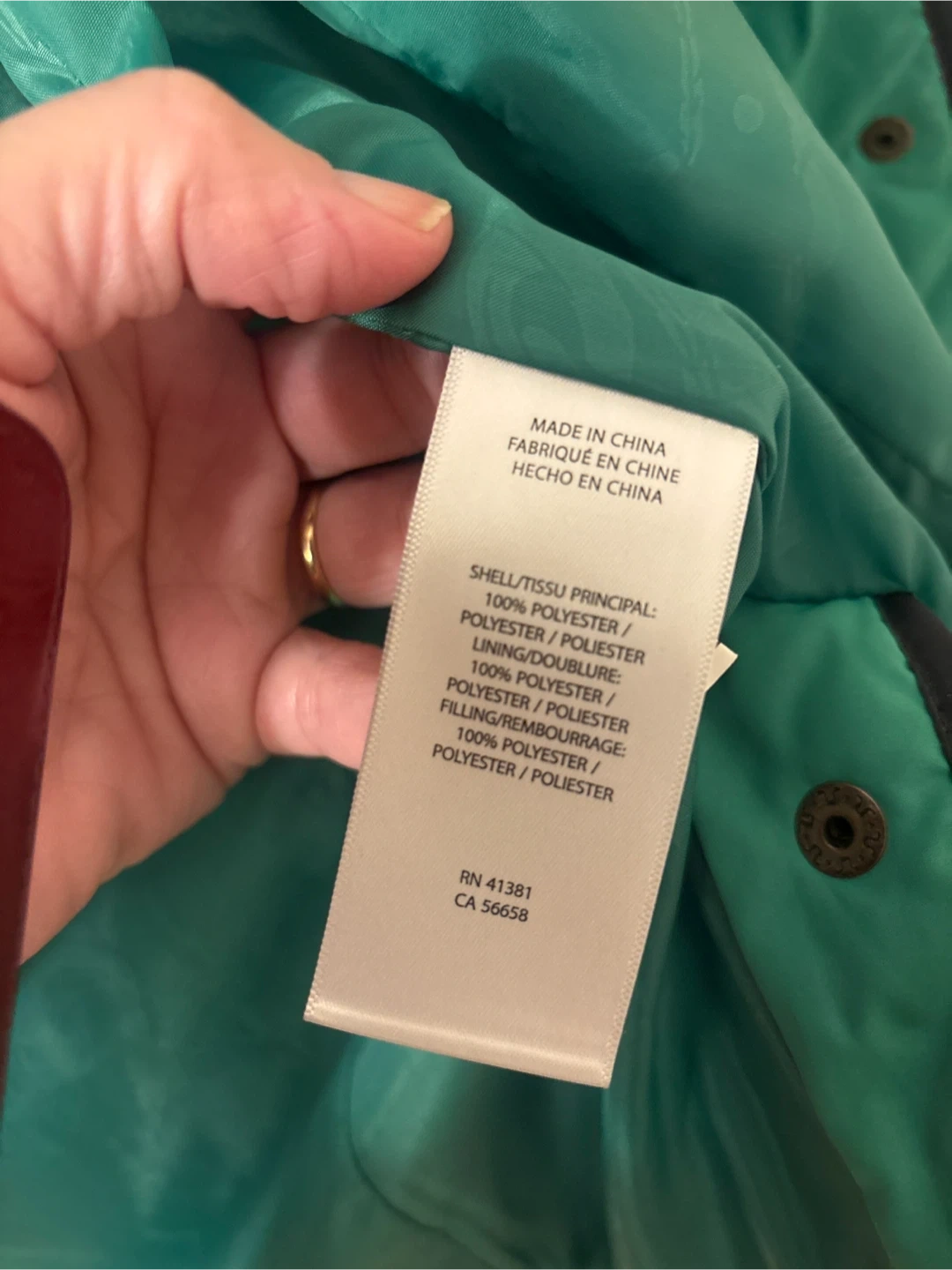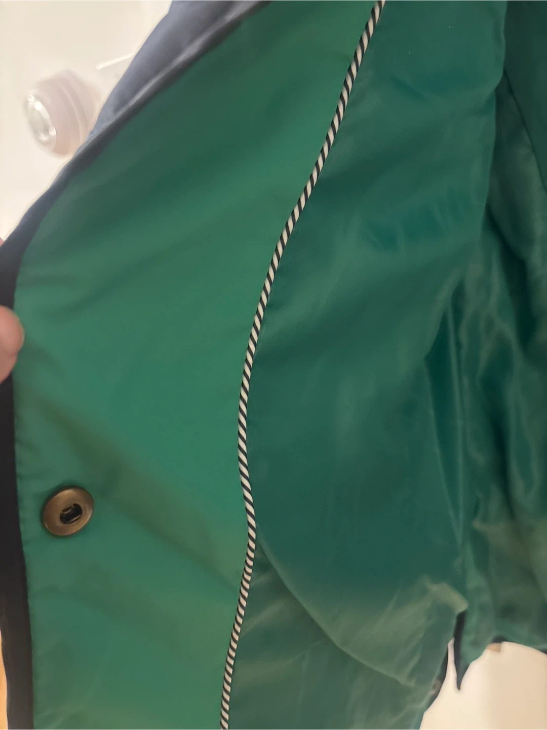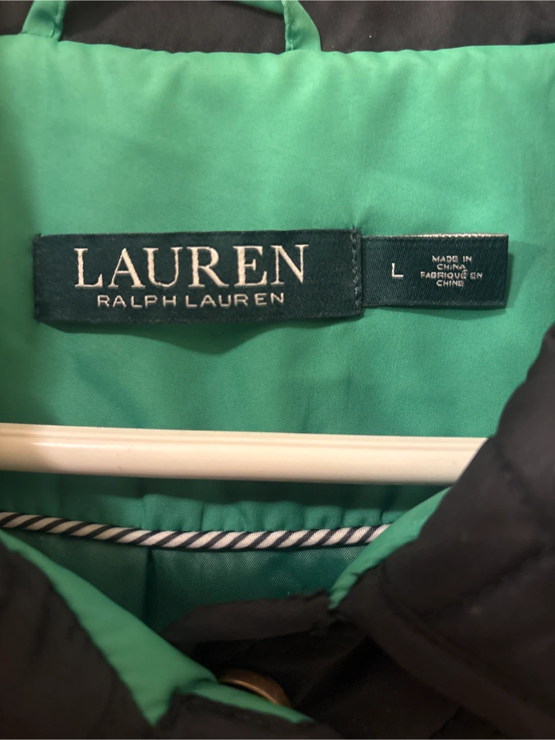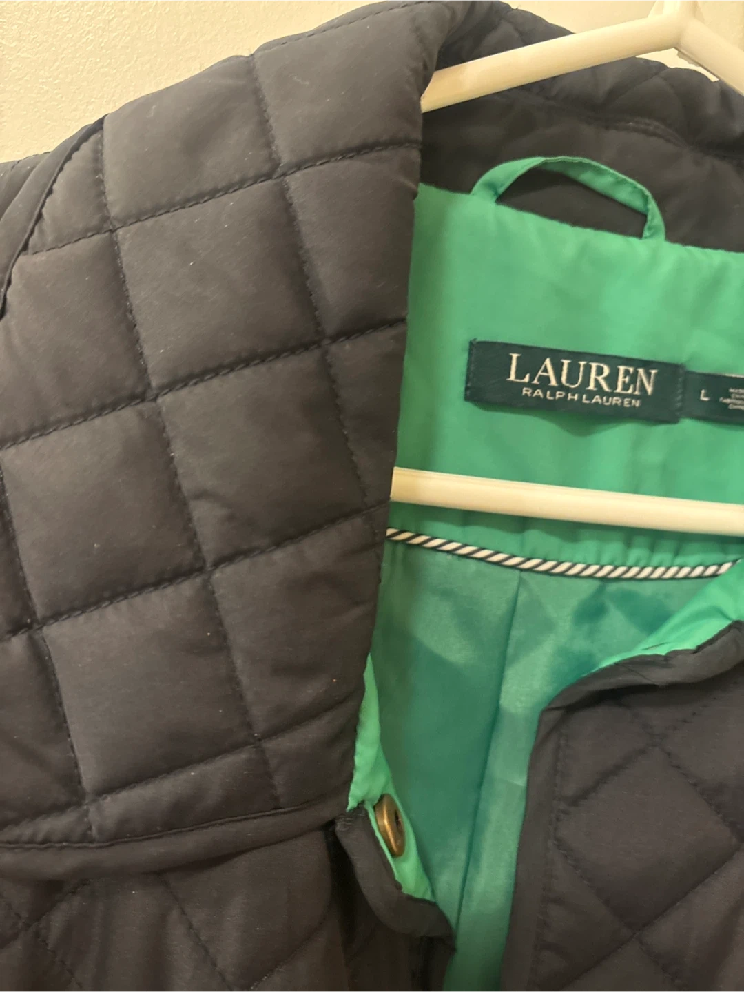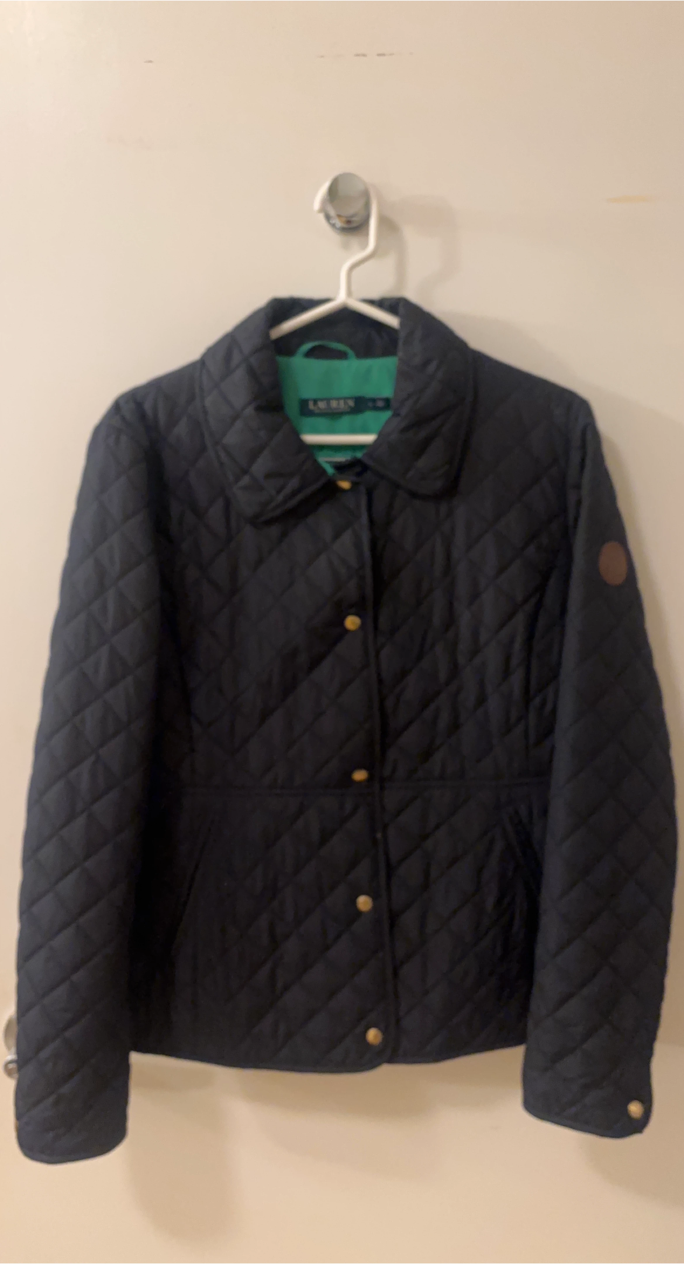 437Selling a Ralph Lauren quilted jacket in blue ! It's a size L and in great condition. The jacket features a classic quilted design with gold-tone buttons and a green lining. Perfect for adding a touch of style to any outfit!