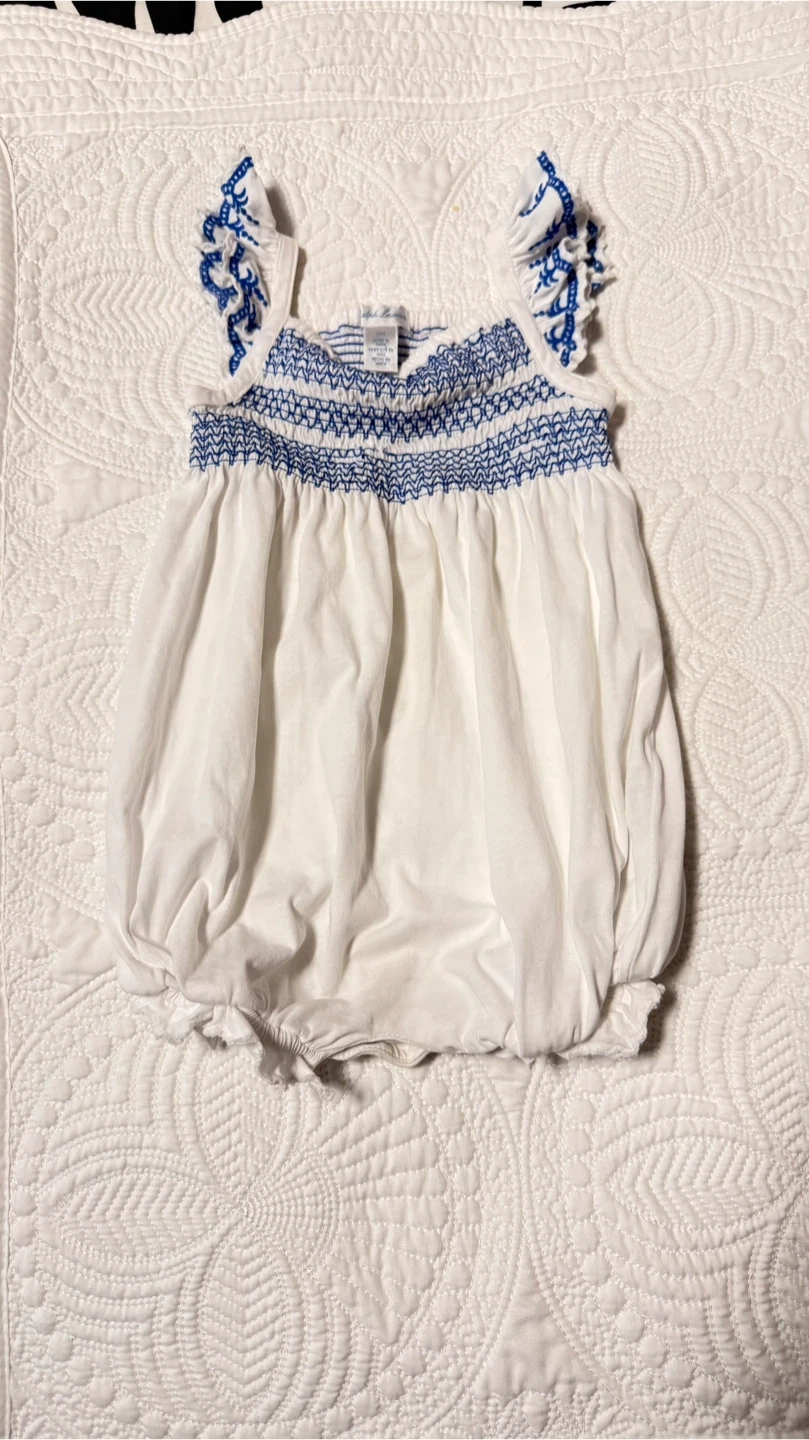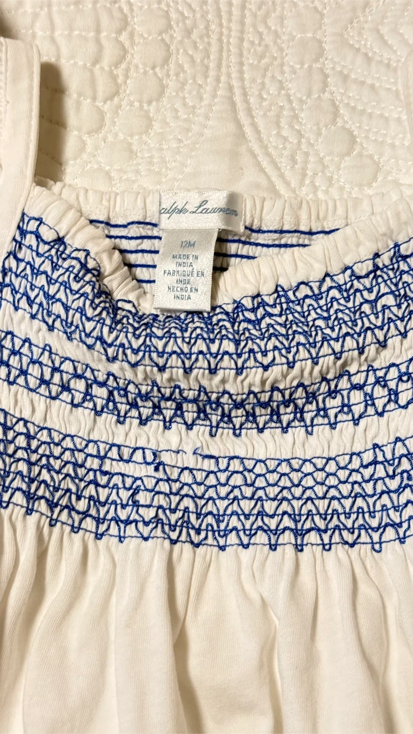 Cute Ralph Lauren romper in size 12M! It's white with blue detailing, perfect for your little one. The material is soft and comfy, great for everyday wear. It is in Good condition… a couple of snapped threads as pictured in the embroidery. No stains no holes no pilling .