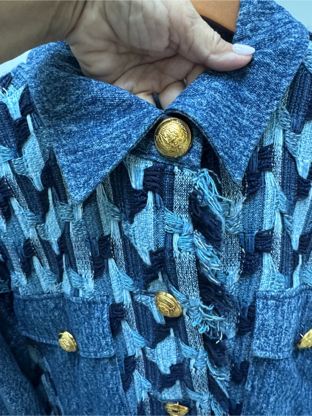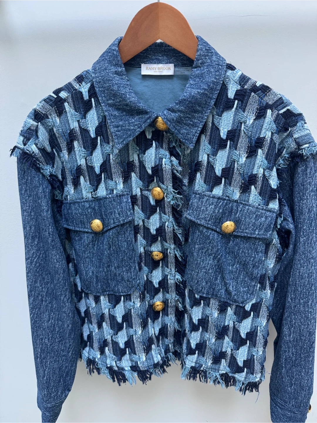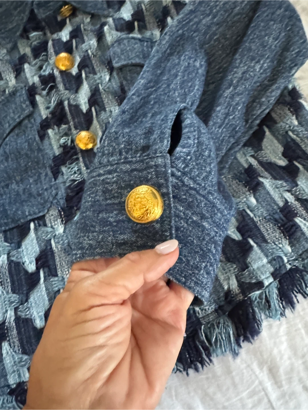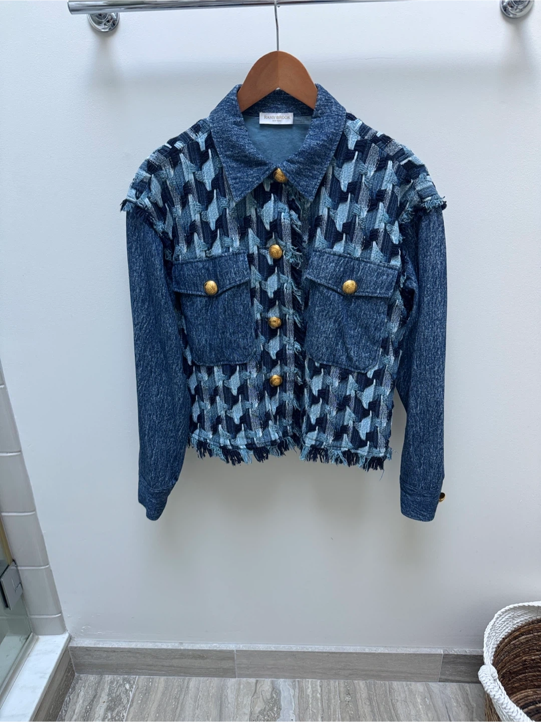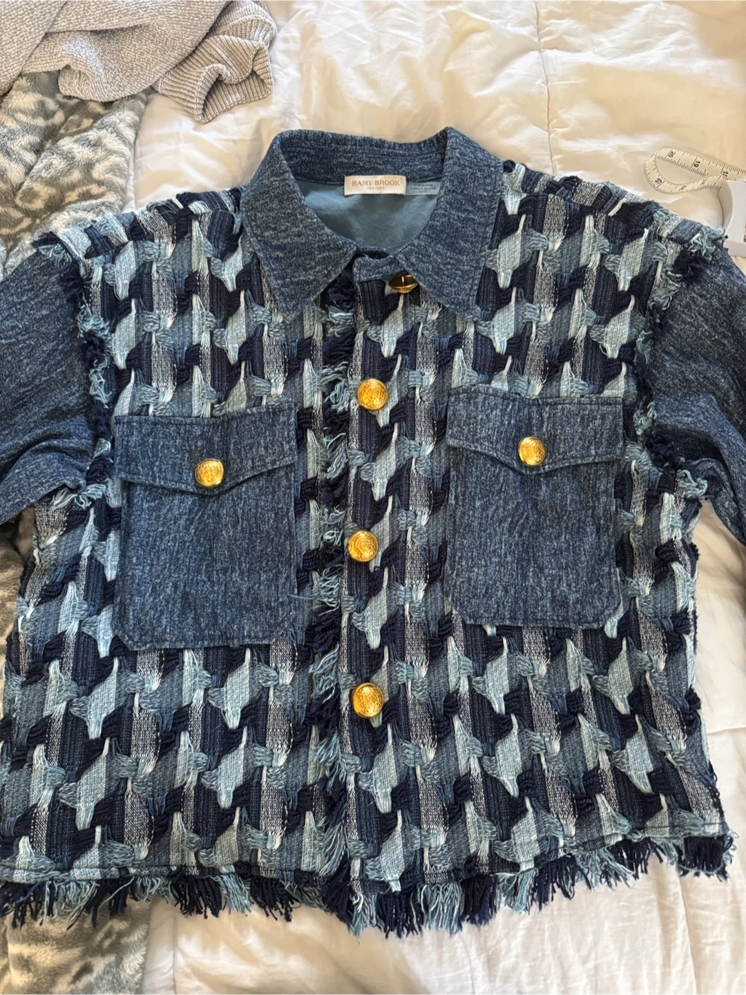This is a stylish blue tweed jacket from Ramy Brook. It features a unique pattern and gold button accents. Perfect for adding a touch of elegance to any outfit! Retail $395