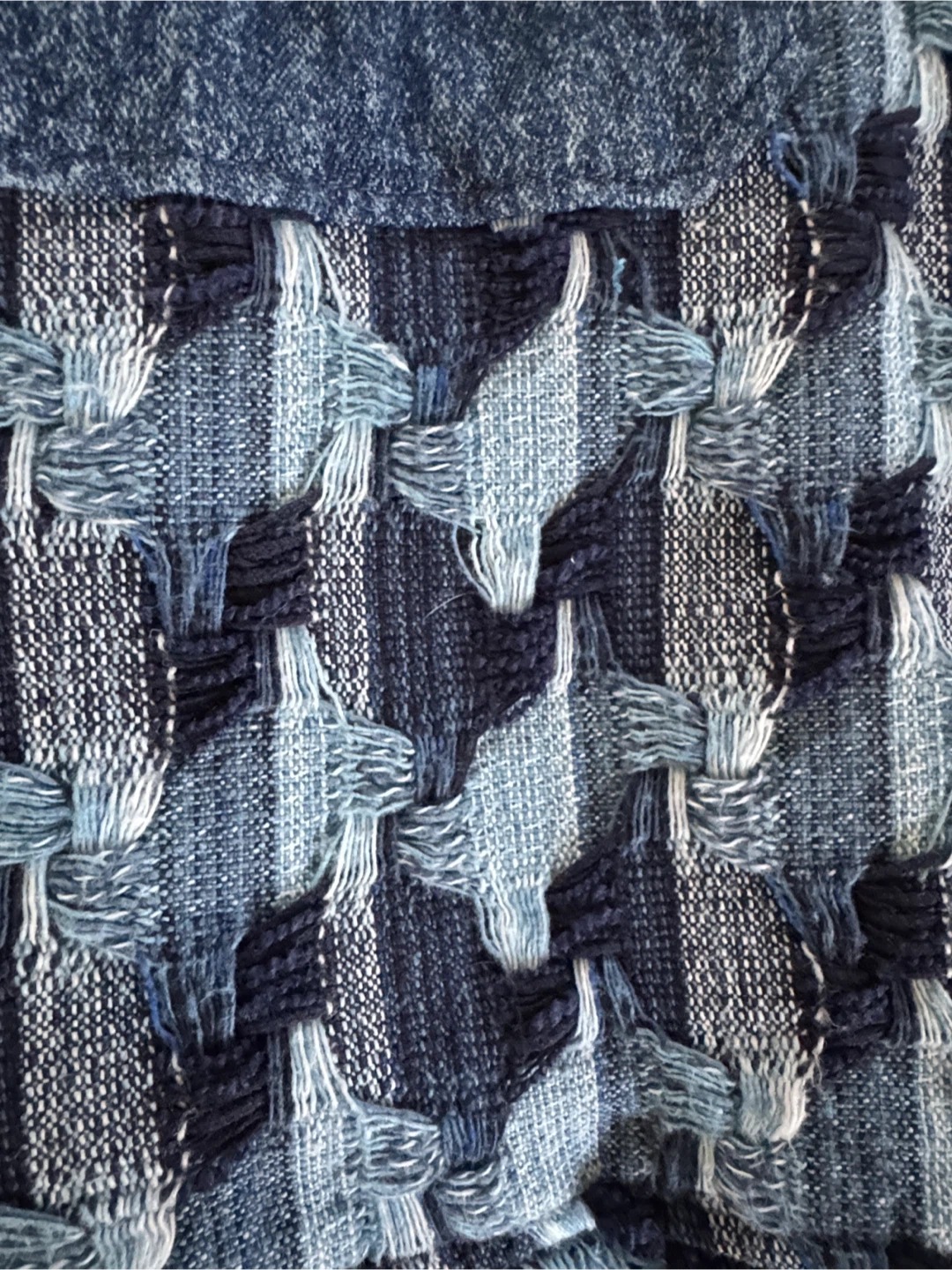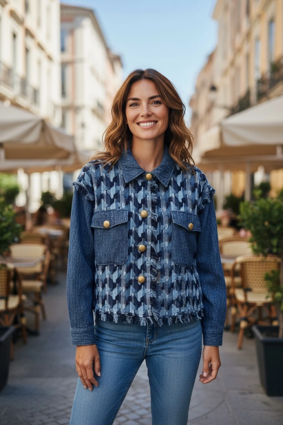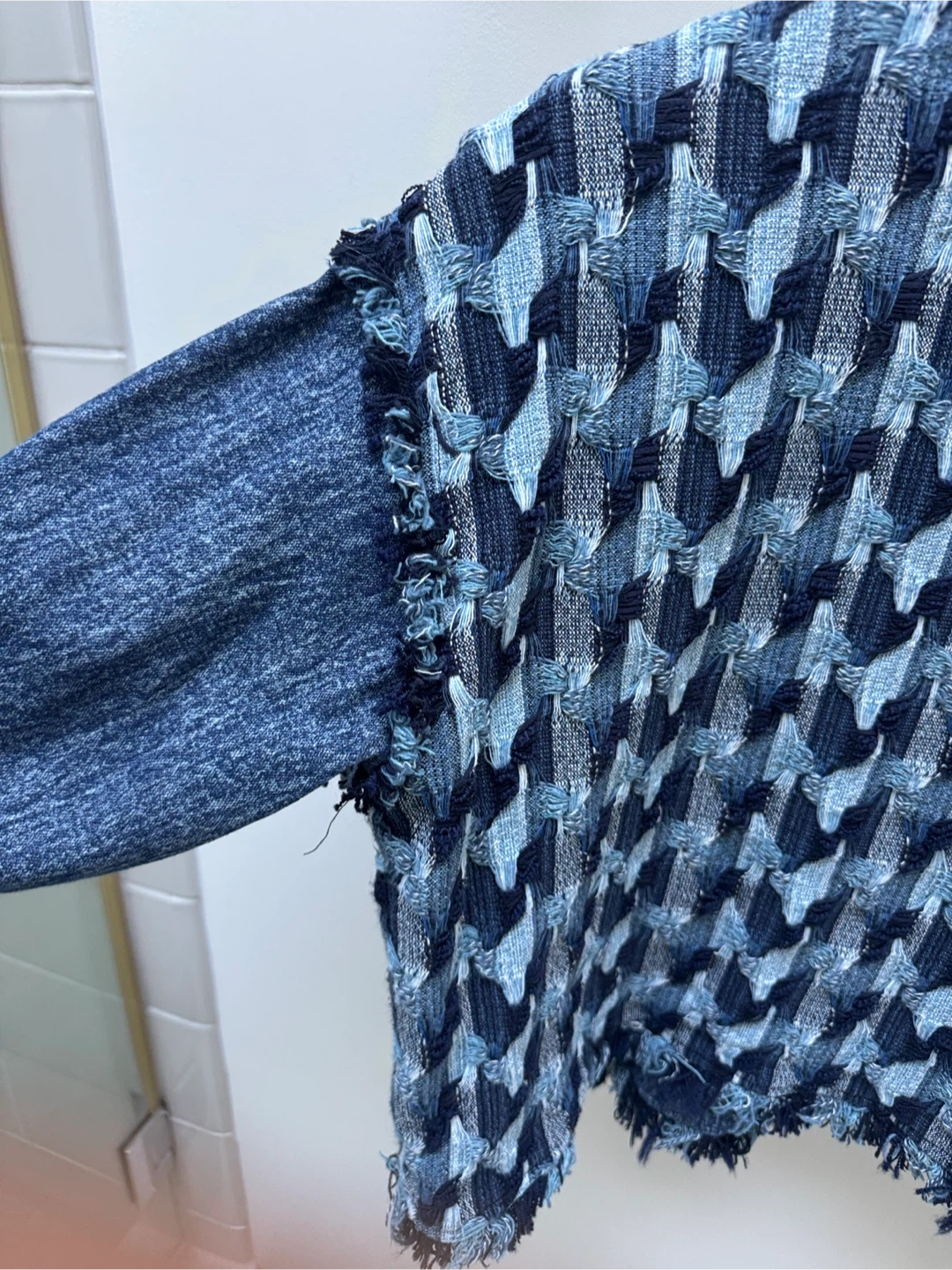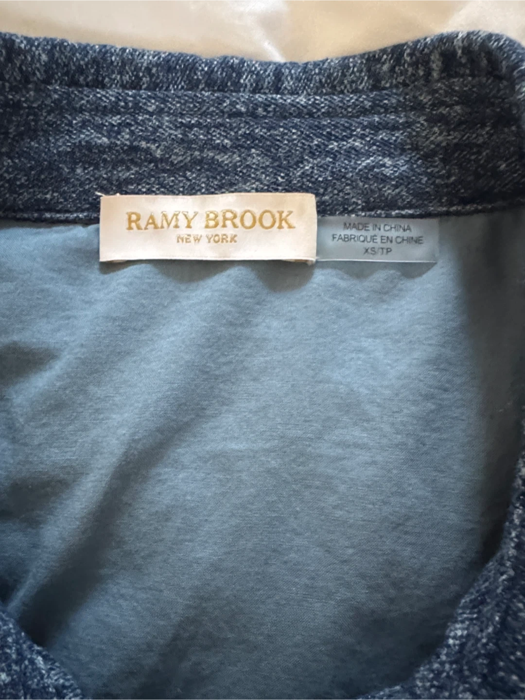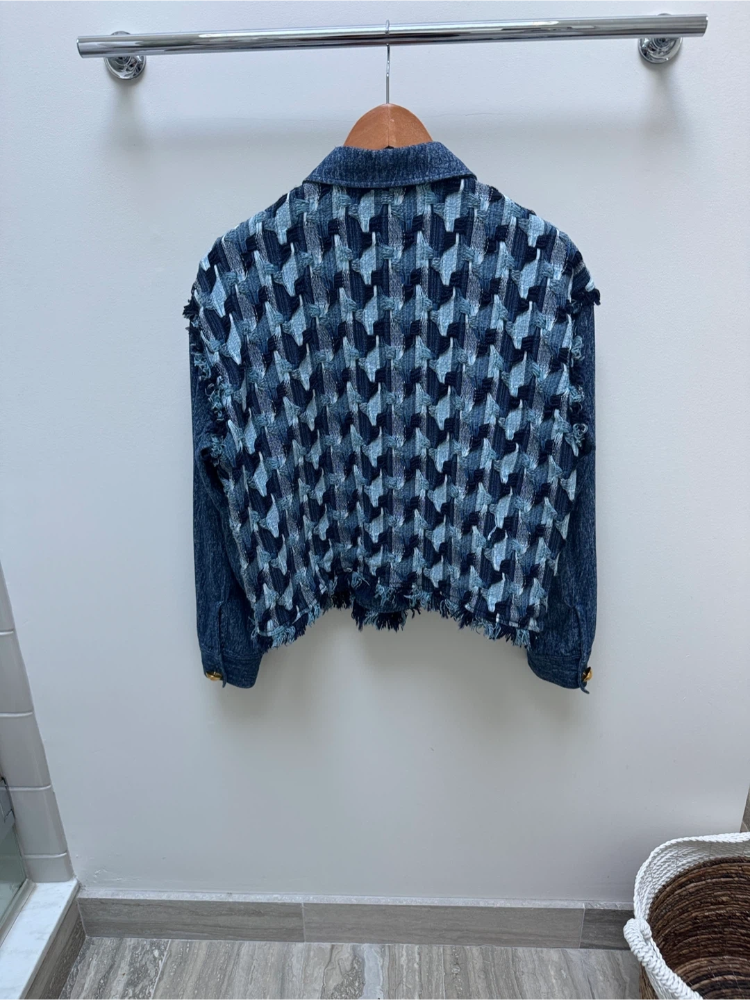 This is a stylish blue tweed jacket from Ramy Brook. It features a unique pattern and gold button accents. Perfect for adding a touch of elegance to any outfit! Retail $395