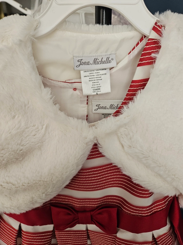 This adorable Rare Editions dress is perfect for your little one! It features a red and white striped pattern with a cute red bow at the waist. The dress comes with a matching white shrug, making it ideal for special occasions or holiday gatherings. It's in great condition and ready for a new home! Size 65