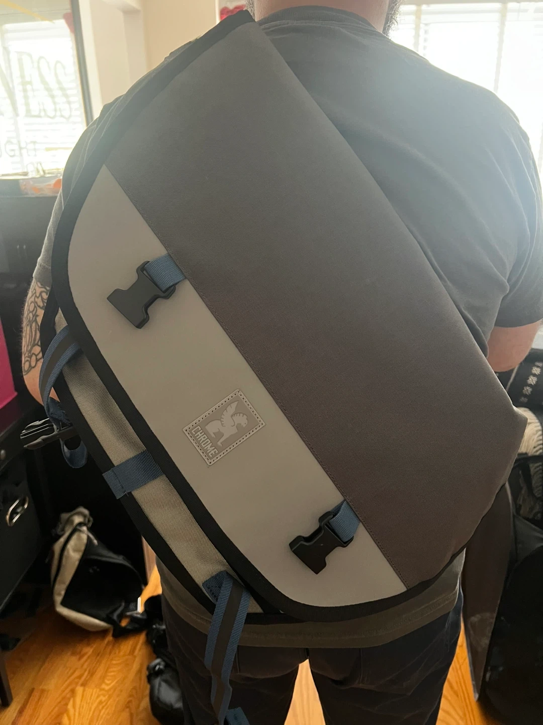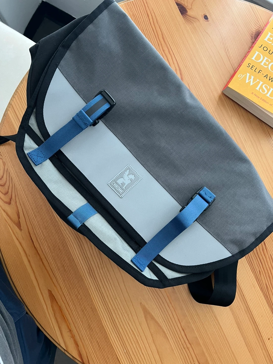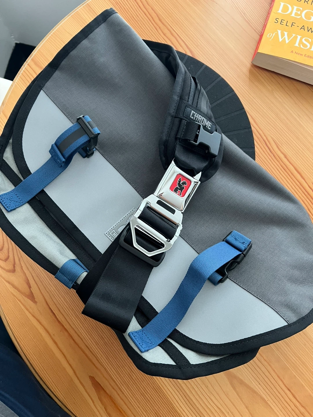 LEAVING NYC IN THE WINTER 🥲 Selling a Chrome Industries messenger bag! It's in great condition and ready for a new owner. Perfect for carrying your essentials around town. It features a seatbelt buckle closure, which is a signature design element of Chrome bags. The bag has a gray and black color scheme with blue accents.