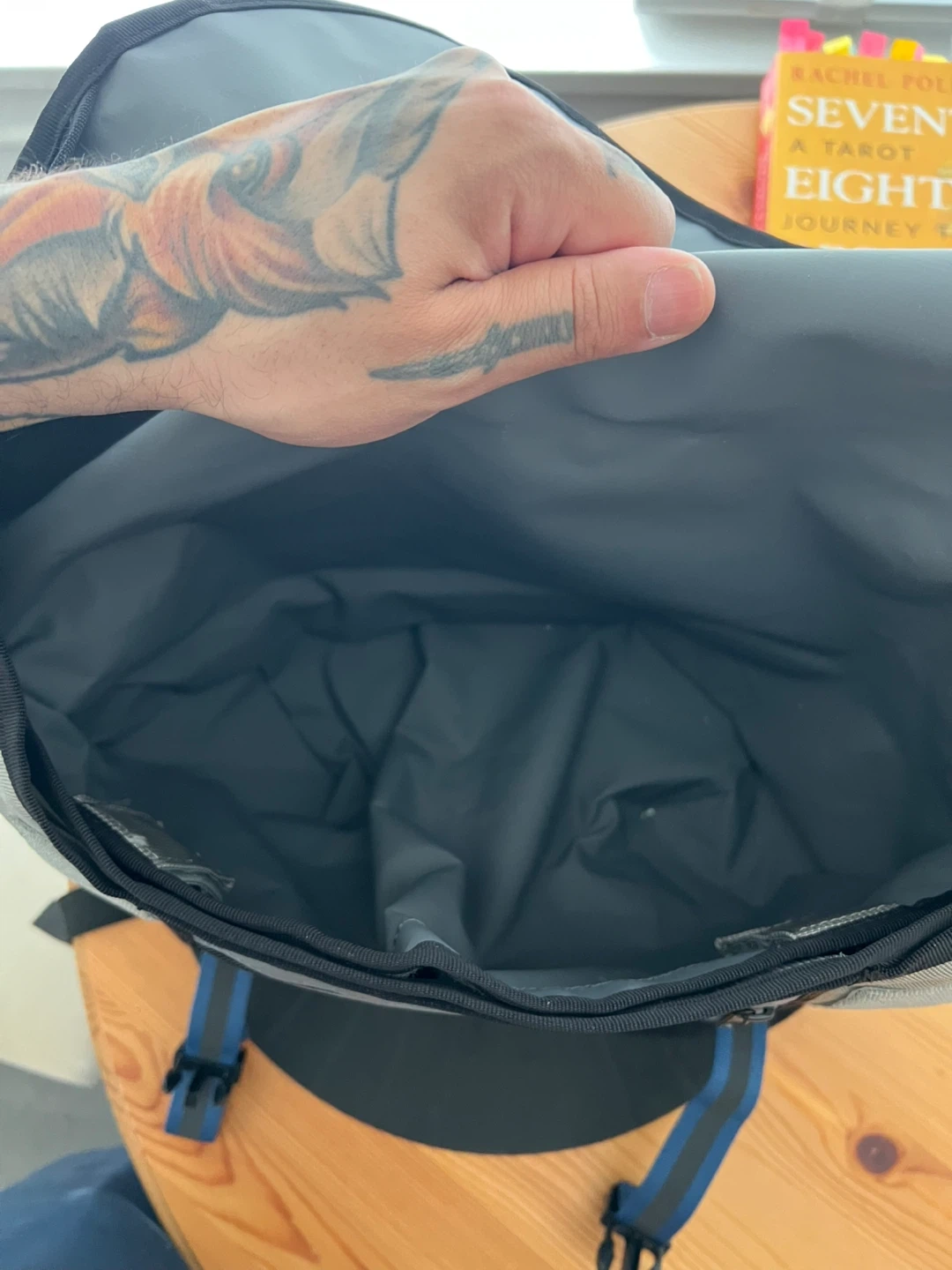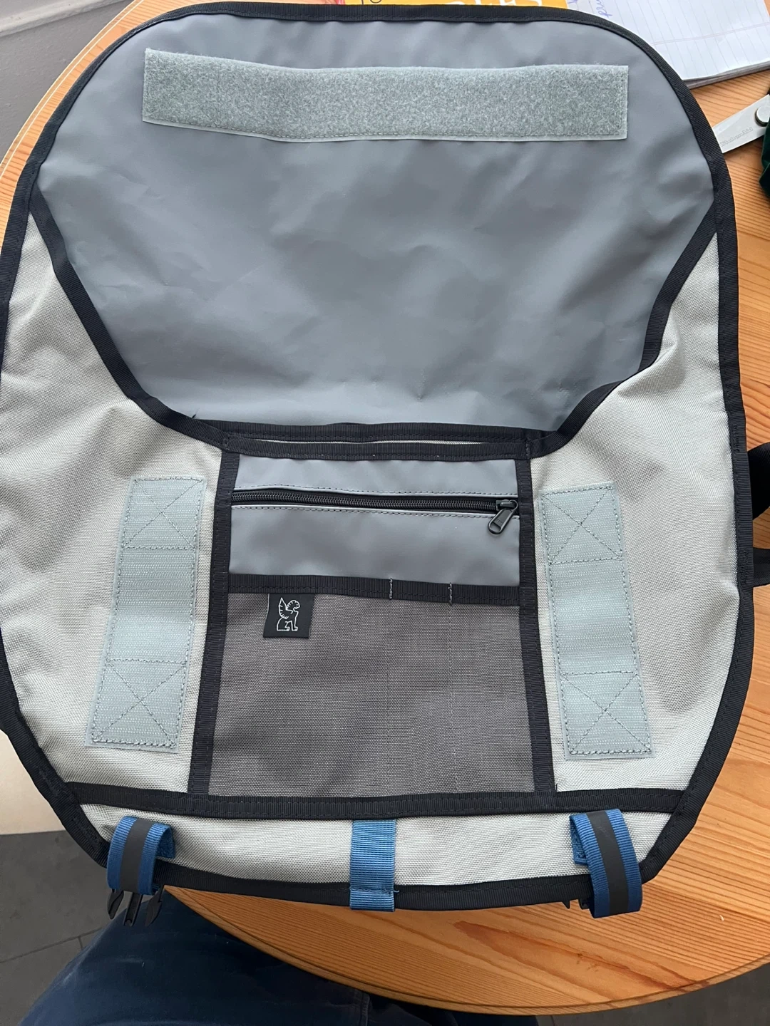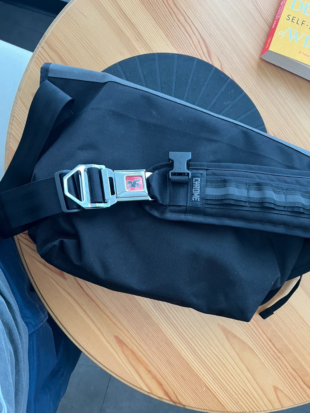 LEAVING NYC IN THE WINTER 🥲 Selling a Chrome Industries messenger bag! It's in great condition and ready for a new owner. Perfect for carrying your essentials around town. It features a seatbelt buckle closure, which is a signature design element of Chrome bags. The bag has a gray and black color scheme with blue accents.
