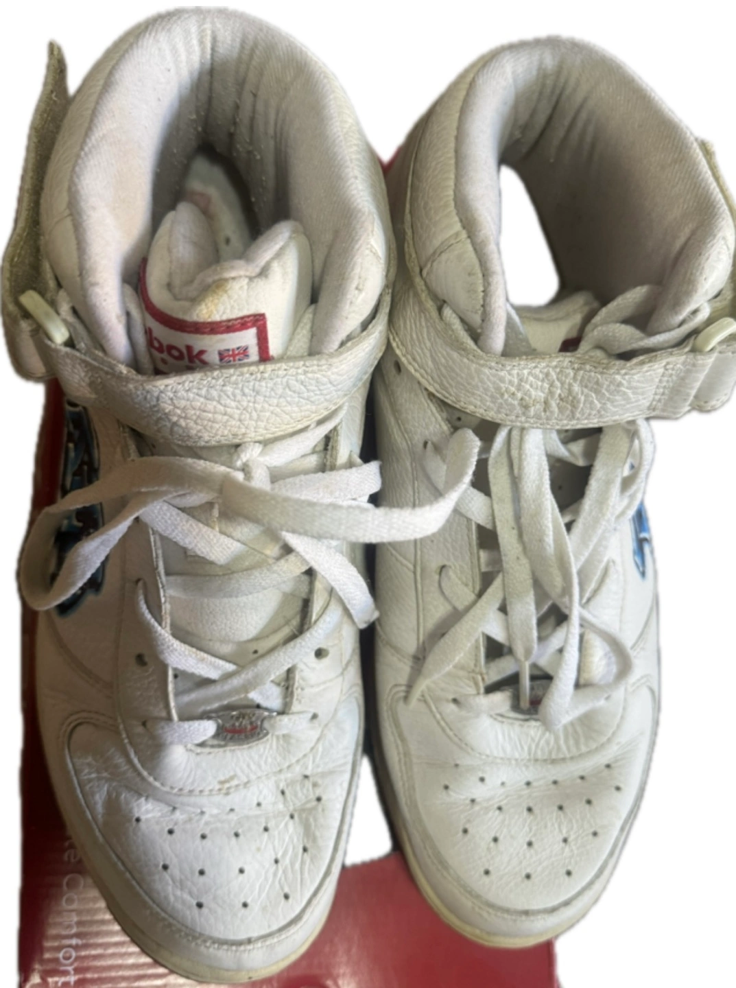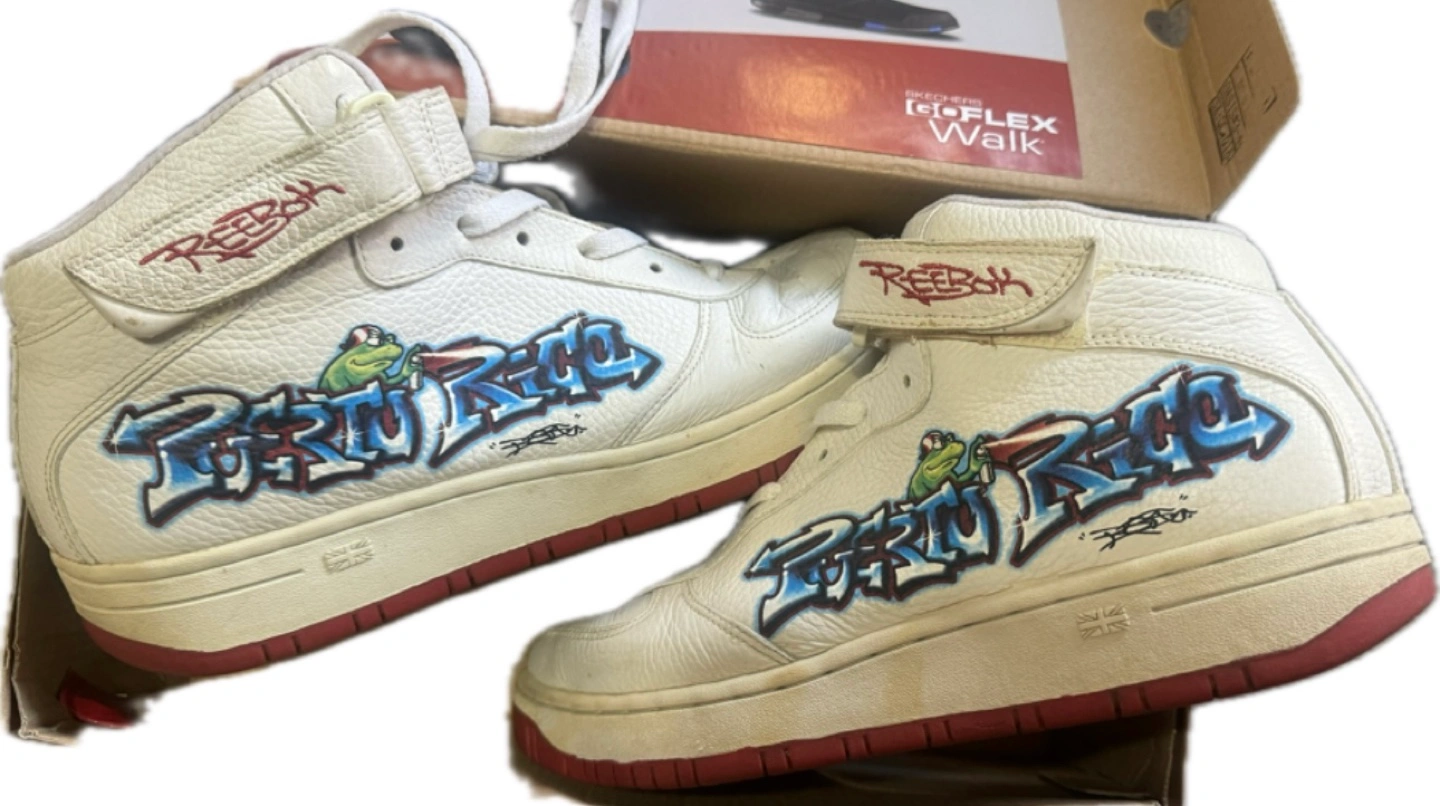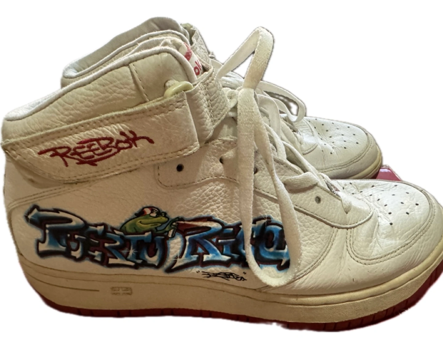 21White leather high top sneakers. Features graffiti design and frog. Reebok logo. Velcro strap closure and laces. Pre-owned.