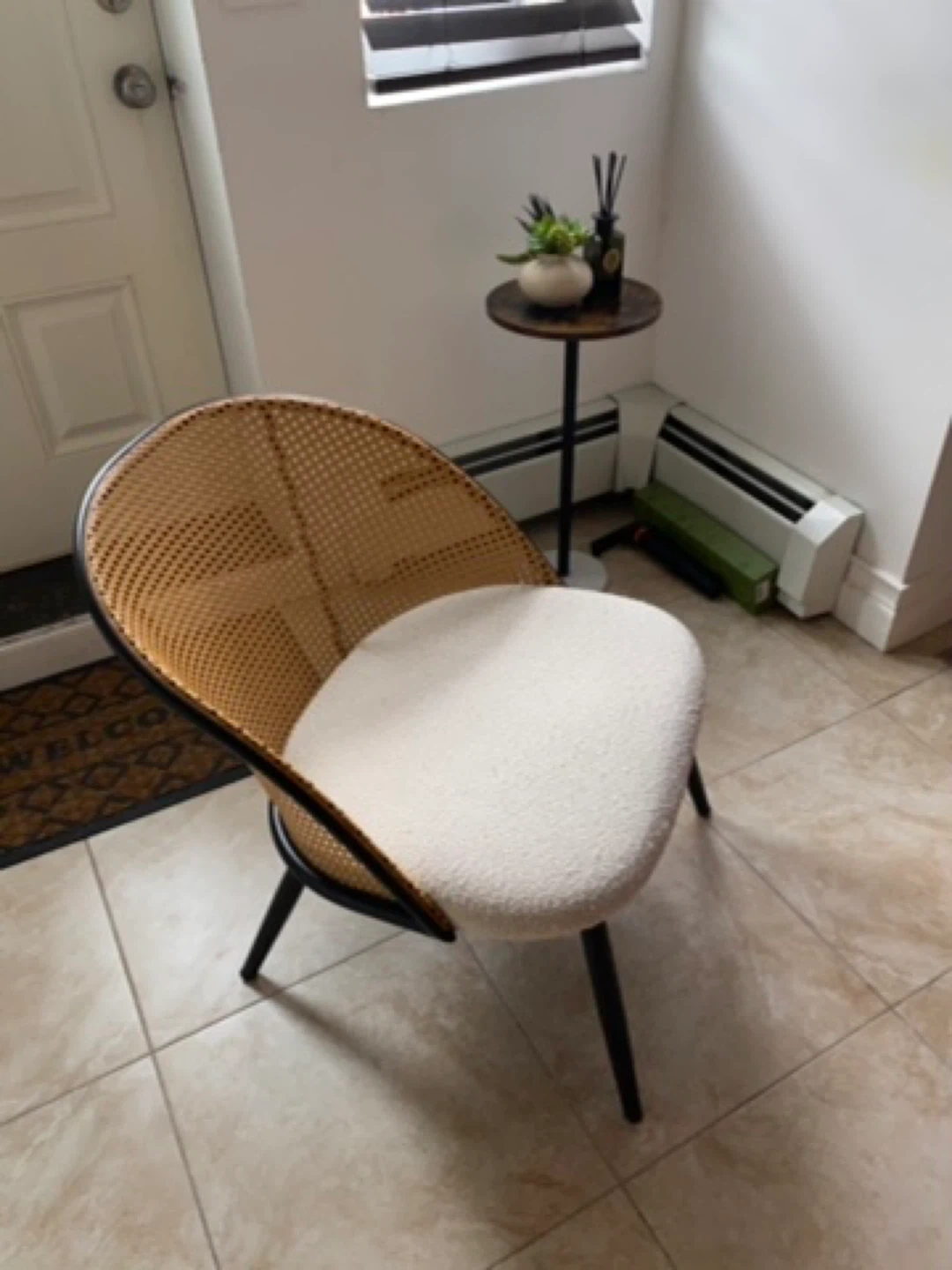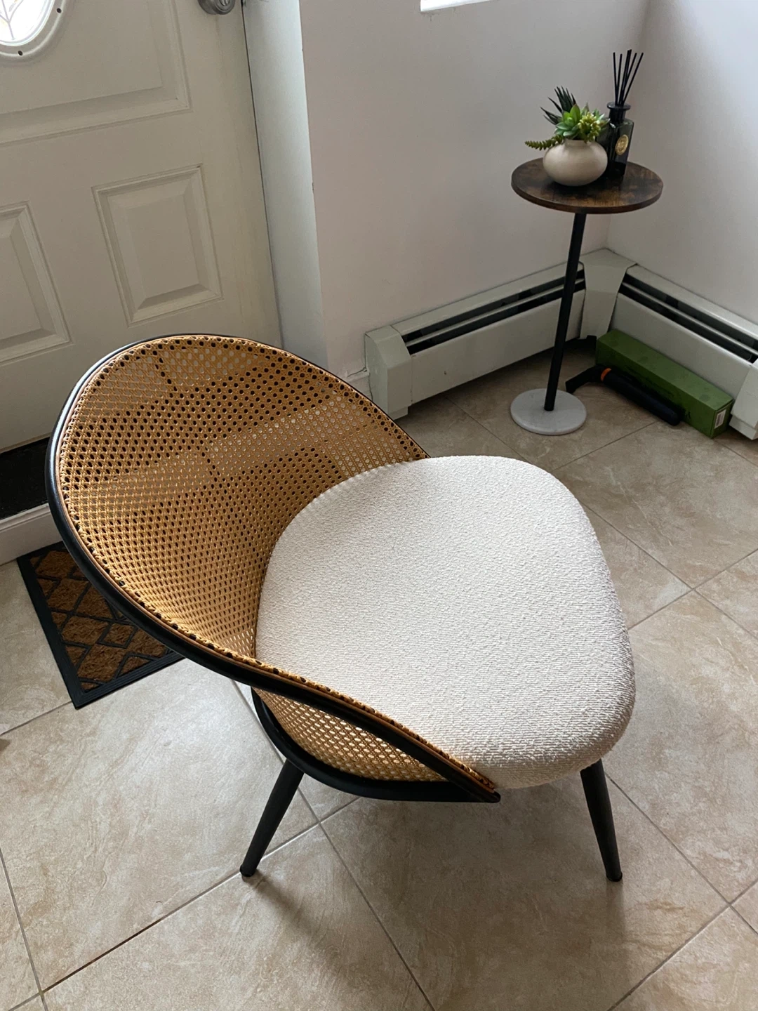 Selling a stylish rattan chair with a comfortable white cushion. It's in great condition and would look great in any room!